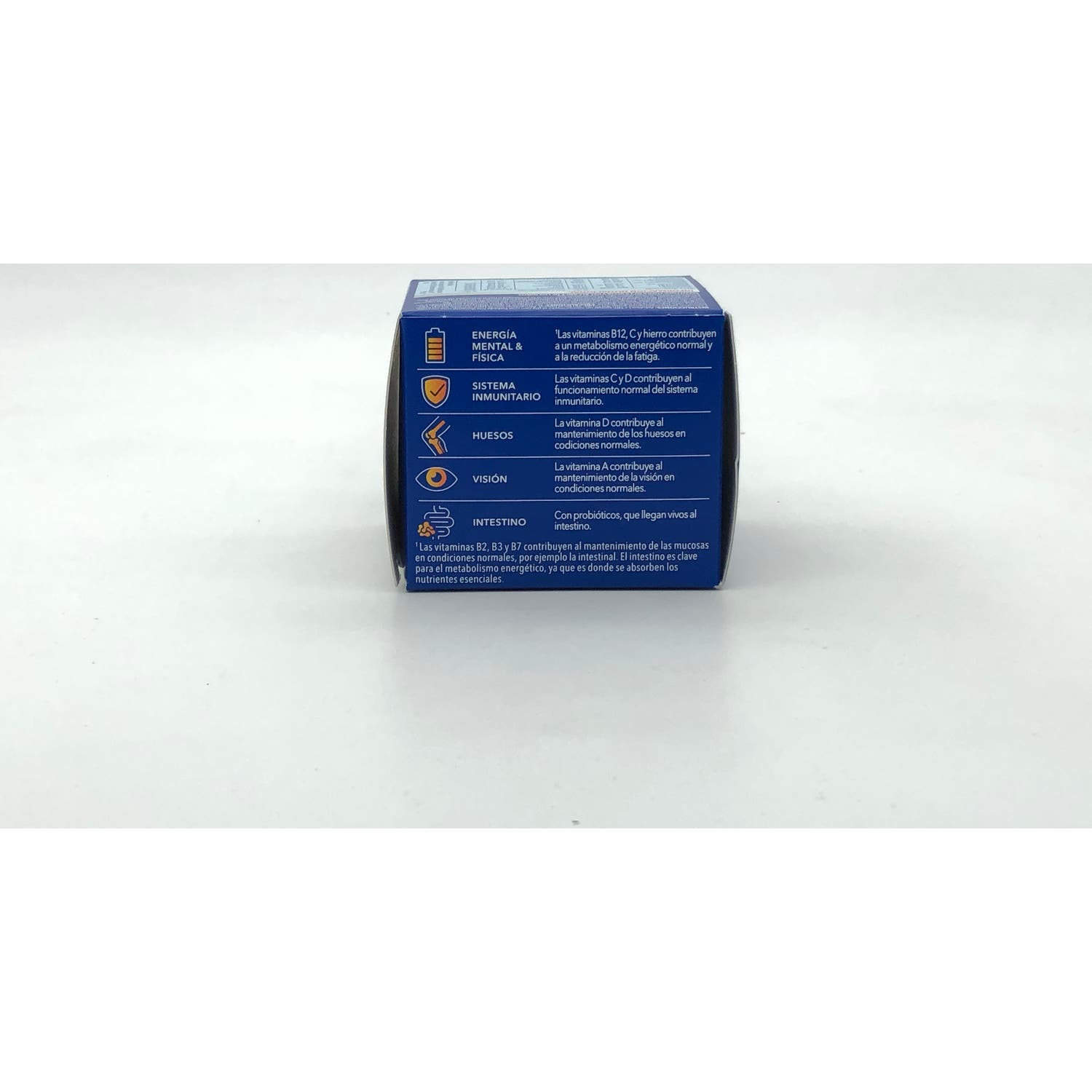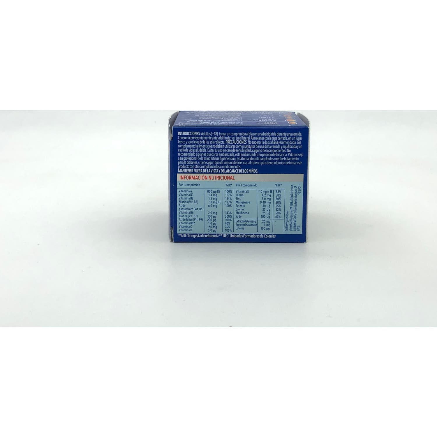 No exceder la dosis diaria recomendada. No recomendado para mujeres embarazadas.Evitar el uso simultáneo con otros productos con vitamina A.Mantener fuera del alcance de los niños.No utilizar en caso de intolerancia o alergia a unos de los ingredientes.Trazas de proteínas de leche, de soja, de pescado y de fenilalanina.Contiene ginseng: interacción posible en caso de hipertensión o con tratamiento anti-vitamina K.En caso de dudas, consultar con un médico o un farmacéutico.Conservar en un lugar seco y fresco.En casos muy poco frecuentes, este producto puede provocar alergias y trastornos gastrointestinales leves.