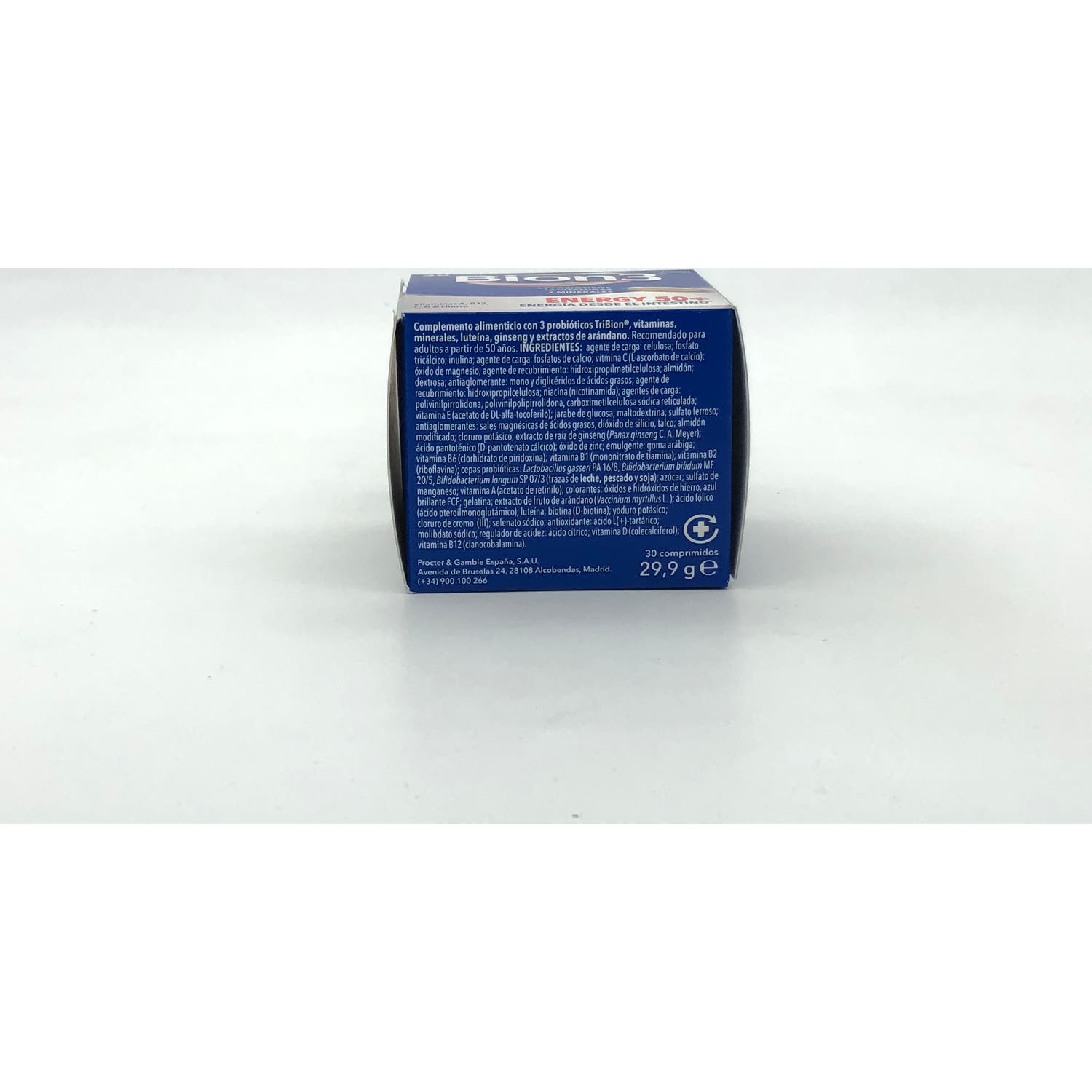 Ingredientes: hidroxipropilcelulosa (E463), hidroxipropilmetilcelulosa (E464), estearato de magnesio (E470n). Preparación de cultivos probióticos: Lactobacillus gasseri, Bifidobacterium bifidum, Bifidobacterium longum, carbonato de calcio, dextrina, almidón de maíz. Vitaminas: ascorbato de calcio, concentrado de acetato de Alfa-Tocoferol, nicotinamida, concentrado sintético de vitamina A, pantotenato de calcio, clorhidrato de piridoxina, concentrado de colecalciferol, nitrato de tiamina, riboflavina, cianocobalamina, ácido fólico, biotina. Oligoelementos: fosfato de calcio, óxido de magnesio, sulfato de hierro hidratado, cloruro de potasio, óxido de zinc, sulfato de manganeso monohidratado, selenatio de sodio, yoduro de potasio, clorhidrato de cromo, molibdato de sodio dihidratado. Extractos de plantas: extracto de ginseng, luteína, extracto de arándano. Excipientes: aglomerante: celulosa microcristalina (E460), polivinilpolipirrolidona (E1201). Emulsificantes: estearato de glicerol (E471), estearato de magnesio (E470b). Colorantes: azul brillante (E133), óxido de hierro (E172). Espesantes: inulina, glucosa, hidroxipropilmetilcelulosa (E464). Antiaglomerante: sílice coloídal (E551). Desagregantes: crospovidona (El202), croscarmelosa sódica (E468).