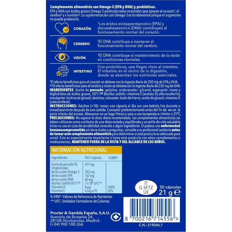 Contiene EPA y DHA, dos ácidos grasos poliinsaturados que son cruciales para la salud cardiovascular. La ingesta diaria recomendada de 250 mg de estos componentes ayuda a mantener:
