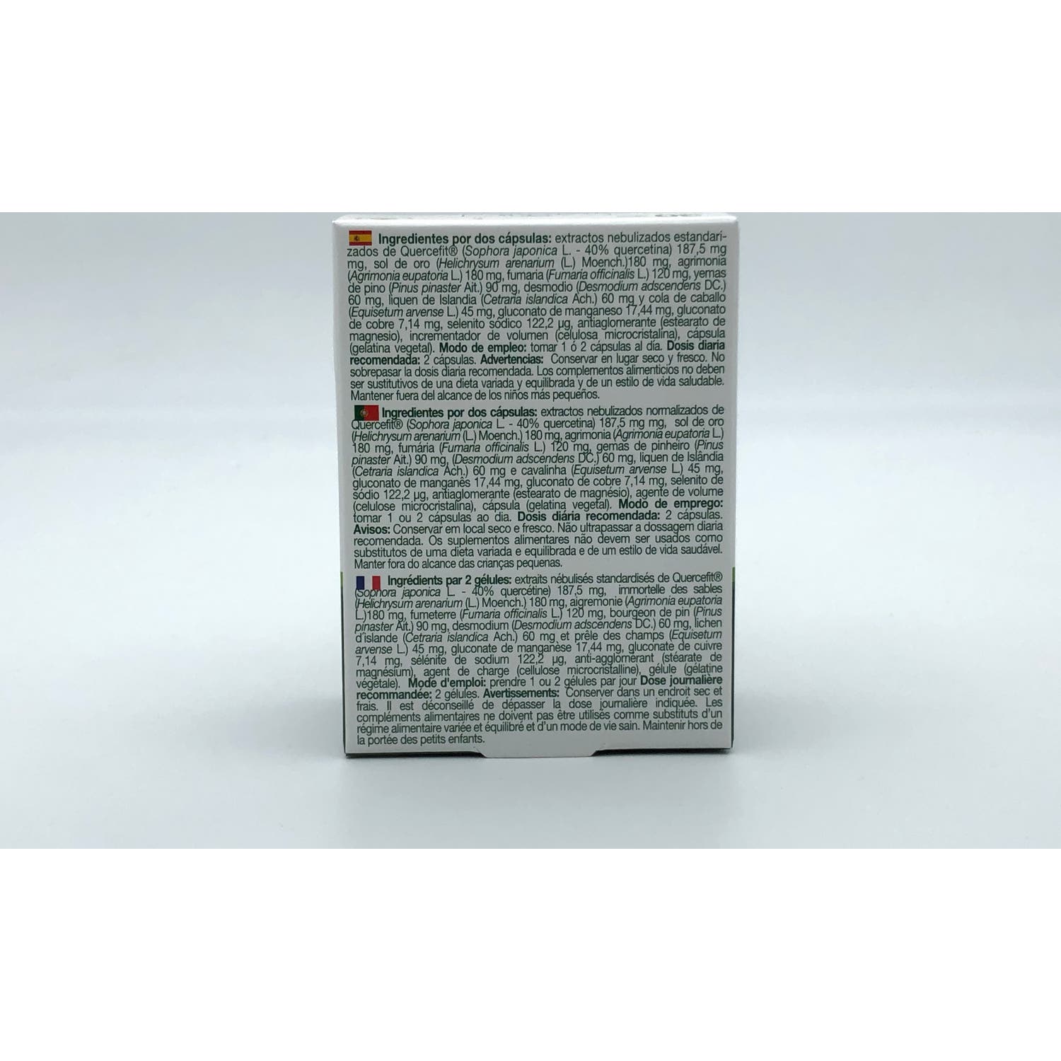 Ingredientes por dos cápsulas: extractos nebulizados estandarizados de acacia de Japón (Sophora japonica L.) 510 mg, sol de oro ((Helichrysum arenarium (L.) Moench.)180 mg, agrimonia (Agrimonia eupatoria L.) 180 mg, fumaria (Fumaria officinalis L.) 120 mg, yemas de pino (Pinus pinaster Ait.) 90 mg, desmodio (Desmodium adscendens DC.) 60 mg, liquen de Islandia (Cetraria islandica Ach.) 60 mg y cola de caballo (Equisetum arvense L.) 45 mg, gluconatos de manganeso y cobre, selenito sódico, antiaglomerante (estearato de magnesio), incrementador de volumen (celulosa microcristalina), cápsula (gelatina vegetal).