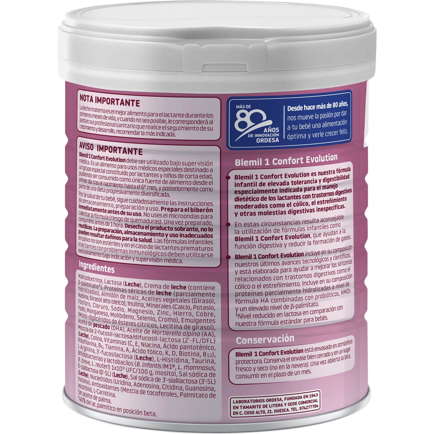 Blemil 1 Confort Evolution 800gr está incluida entre las leches especiales debido a su especial formulación, ideada para evitar los cólicos de los lactantes en bebés desde el nacimiento.