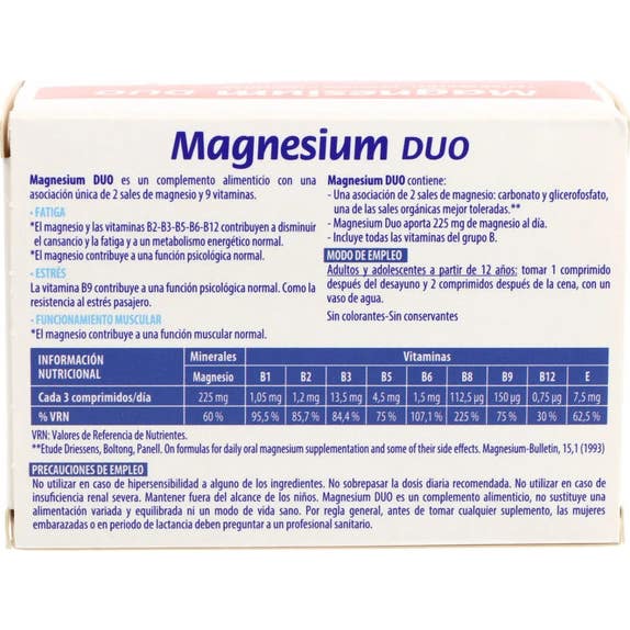 MAGNESIUM DUO es un complemento alimenticio con una fórmula única que combina 2 sales de magnesio con 9 vitaminas: