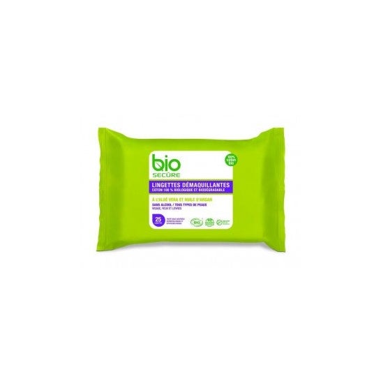 Sin parabenos Sin aluminio Sin fenoxietanol. Sin aclarado. Sin perfume. Sin alcohol INFORMACIÓNLas toallitas desmaquillantes Bio Secure están fabricadas con algodón 100% ecológico y biodegradable. Dermatológicamente testadas, dejan el rostro, los ojos y los labios libres de maquillaje, incluso el resistente al agua. La piel queda flexible y suave al tacto. Estas toallitas contienen aloe vera para hidratar y aceite de argán para suavizar incluso las pieles más sensibles.