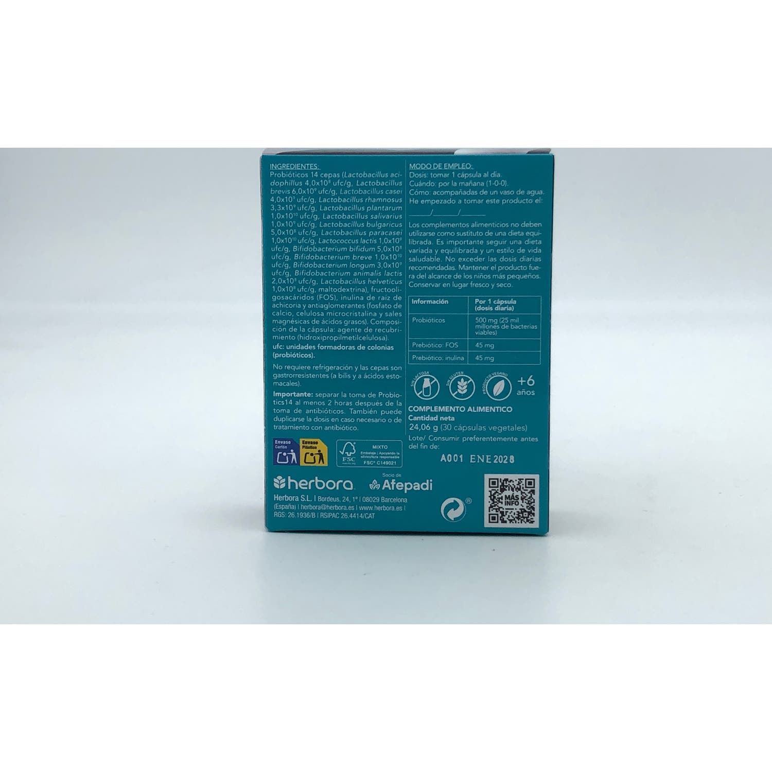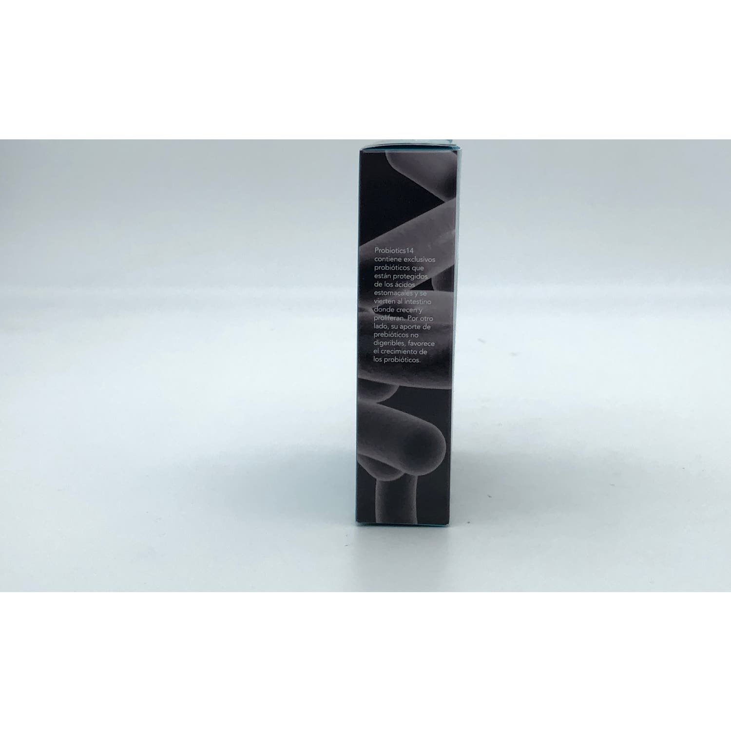 Por 1 cápsula: Probióticos 14 cepas: (Lactobacillus acidophillus 4.0x109 ufc/g; Lactobacillus brevis 2.5x109 ufc/g; Lactobacillus casei 2.5x109 ufc/g; Lactobacillus rhamnosus 2.5x109 ufc/g; Lactobacillus plantarum 2.5x109 ufc/g; Lactobacillus salivarius 2.5x109 ufc/g; Lactobacillus bulgaricus 2.5x109 ufc/g; Lactobacillus paracasei 4.5x109 ufc/g; Lactococcus lactis 1.5x109 ufc/g; Bifidobacterium bifidum 7.0x109 ufc/g; Bifidobacterium breve 4.5x109 ufc/g; Bifidobacterium longum 6.5x109 ufc/g; Bifidobacterium lactis 4.5x109 ufc/g; Streptococcus thermophilus 1.5x109 ufc/g) 500 mg (25 mil millones de bacterias viables)Prebióticos: FOS-Fructooligosacáridos 45 mg; Inulina-Fibra de achicoria 45 mg.