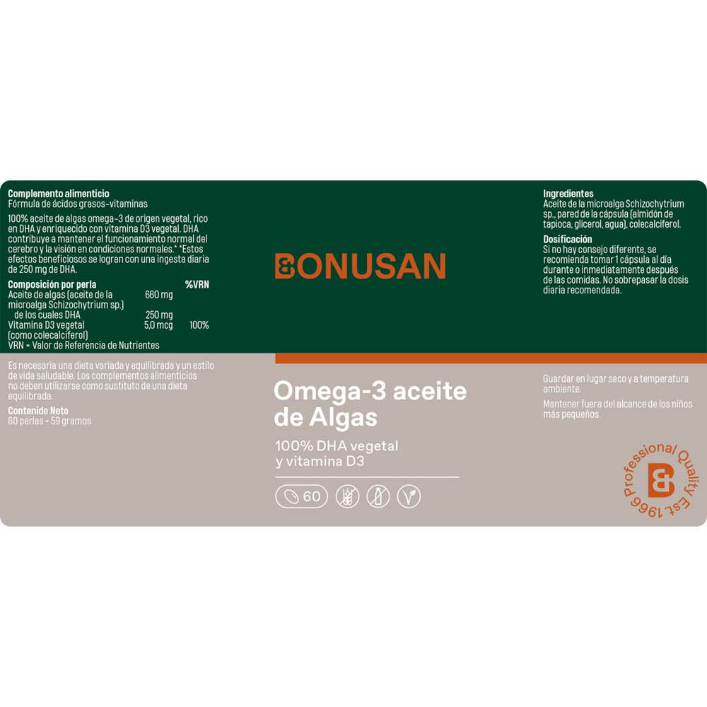 Bonusan Aceite De Algas Omega 3 60caps es un complemento alimenticio 100% vegetal, a base de aceite de algas, que ayuda a dar soporte al sistema cognitivo.