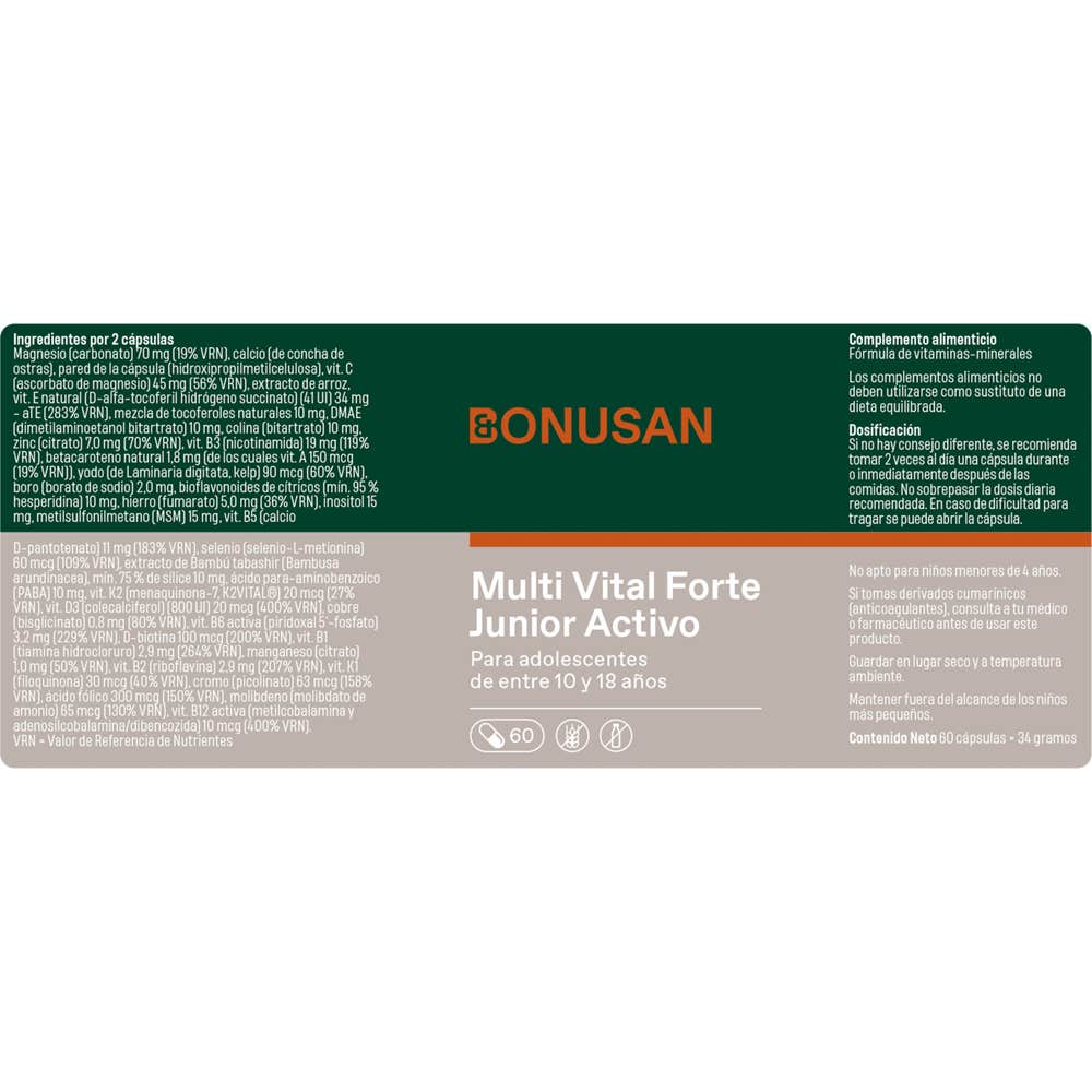 Bonusan Multi Vital Junior Activo 30caps es un complemento alimenticio multivitamínico diseñado para niños y adultos jóvenes.
