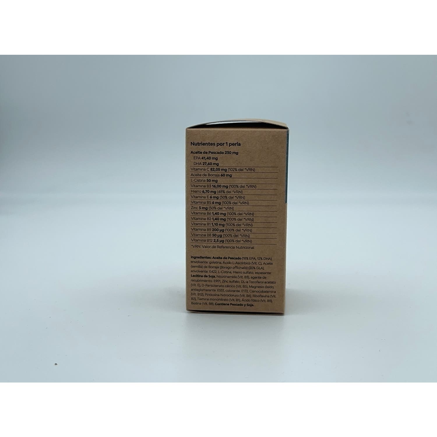 Aceite de Pescado(18% EPA, 12% DHA) 230 mg, Vitamina C 82,05 mg (102% del VRN), Aceite (semilla) de Borraja (Borago officinalis) (20% GLA) 60 mg, L- Cistina 50 mg, Vitamina B3 16,00 mg (100% del VRN), Hierro 6,70 mg (48% del VRN), Vitamina E 6 mg (50% del VRN), Vitamina B5 6 mg (100% del VRN), Zinc 5 mg (50% del VRN), Vitamina B6 1,40 mg (100% del VRN), Vitamina B2 1,40 mg (100% del VRN), Vitamina B1 1,10 mg (100% del VRN), Vitamina B9 0,20 mg (100% del VRN), Vitamina B8 0,05 mg (100% del VRN), Vitamina B12 2,5 μg (100% del VRN).