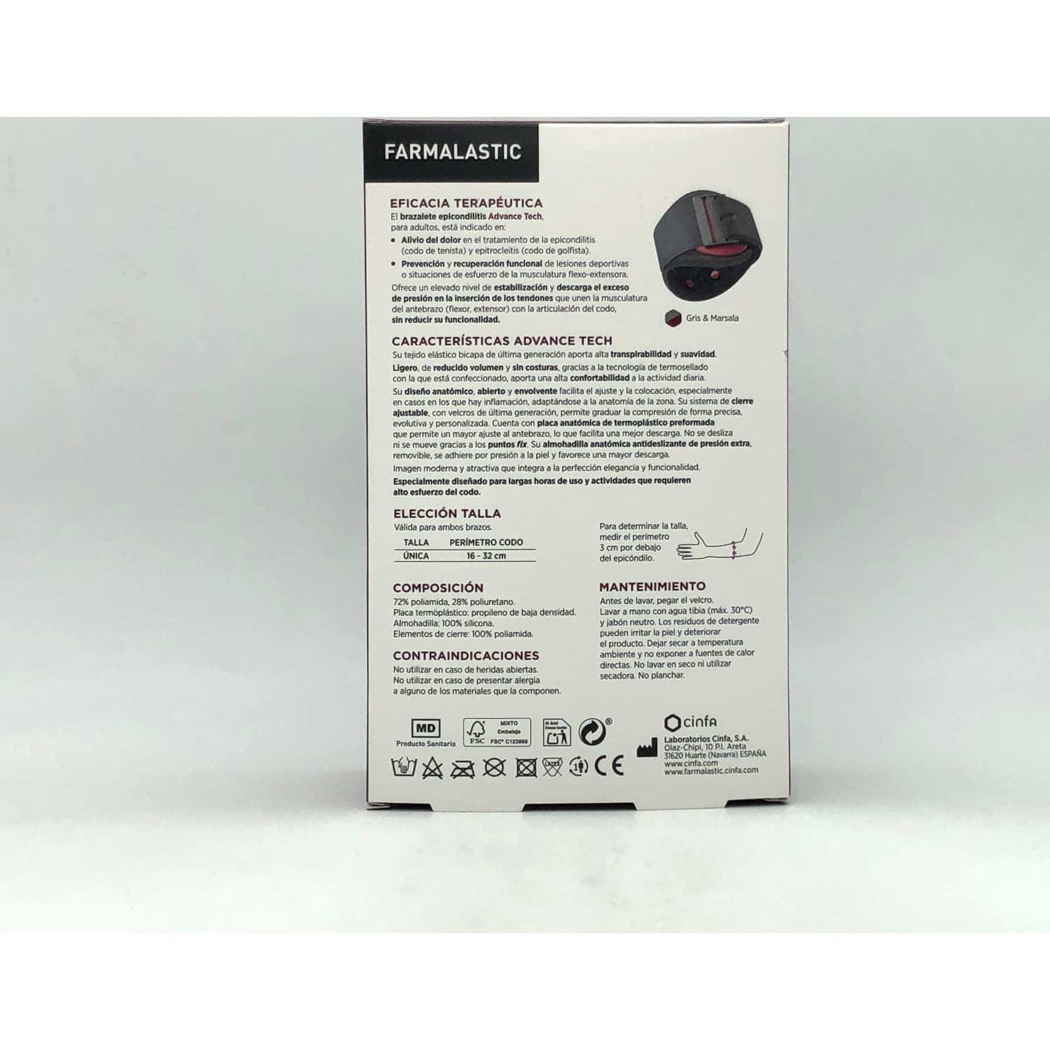 Brazalete Epicondilitis Farmalastic Advance Fix T Única ayuda a aliviar el dolor de codo de tenista o golfista. Su diseño busca descargar el exceso de presión en los tendones que unen la musculatura del antebrazo con la articulación del codo. Su tecnología no reduce la funcionalidad del brazo, ya que se adapta a la anatomía y no desliza pese a utilizarse durante horas.