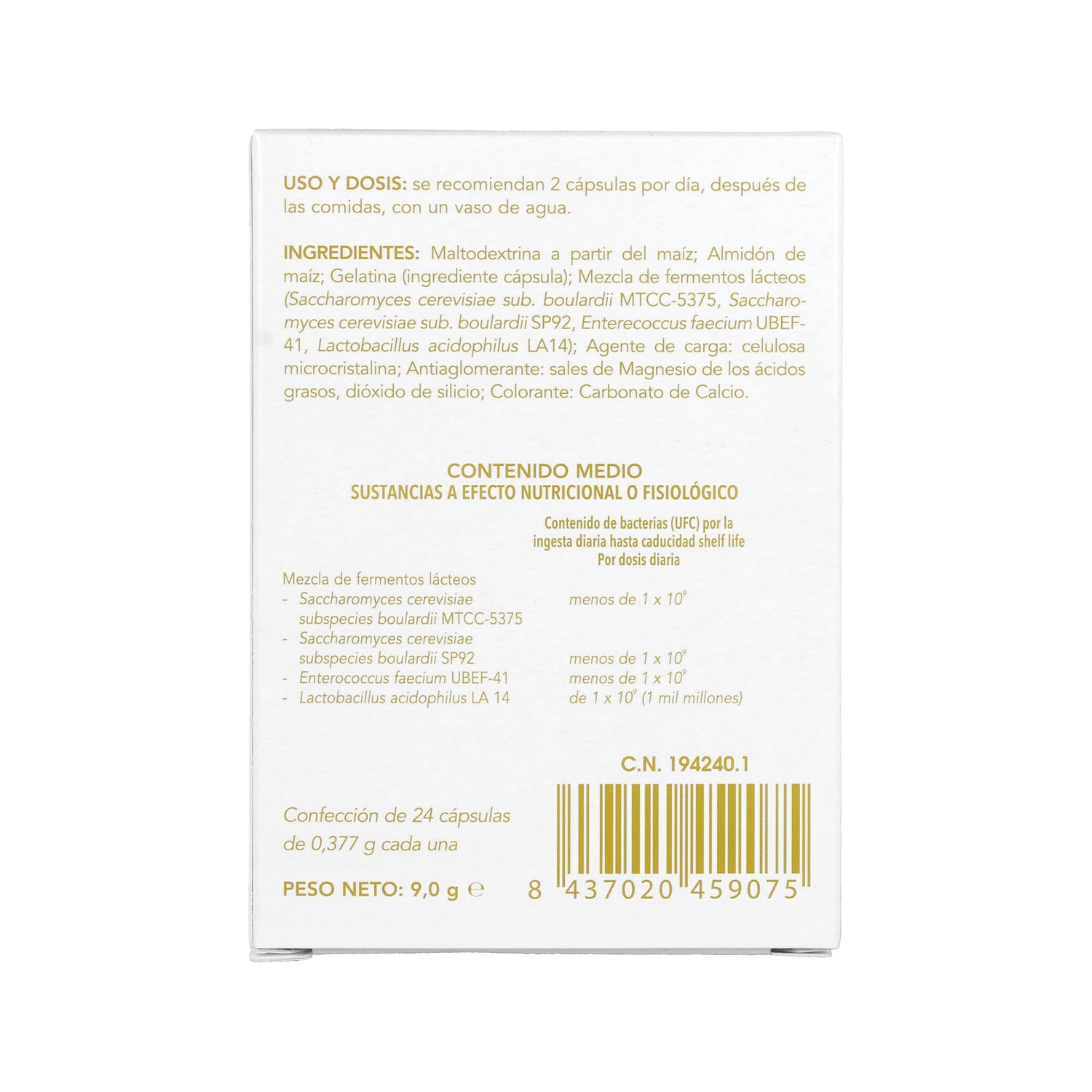 Complemento alimenticio a base de fermentos lácteos (probióticos) que contribuye a un correcto equilibrio de la flora bacteriana intestinal, favoreciendo el buen funcionamiento del sistema digestivo, asimilando correctamente los nutrientes y a su vez, eliminando toxinas y parte del colesterol que consumimos. Indicado para personas con alteraciones del tránsito intestinal como evacuaciones acuosas, flatulencias o enfermedades inflamatorias del tipo intestino irritable.