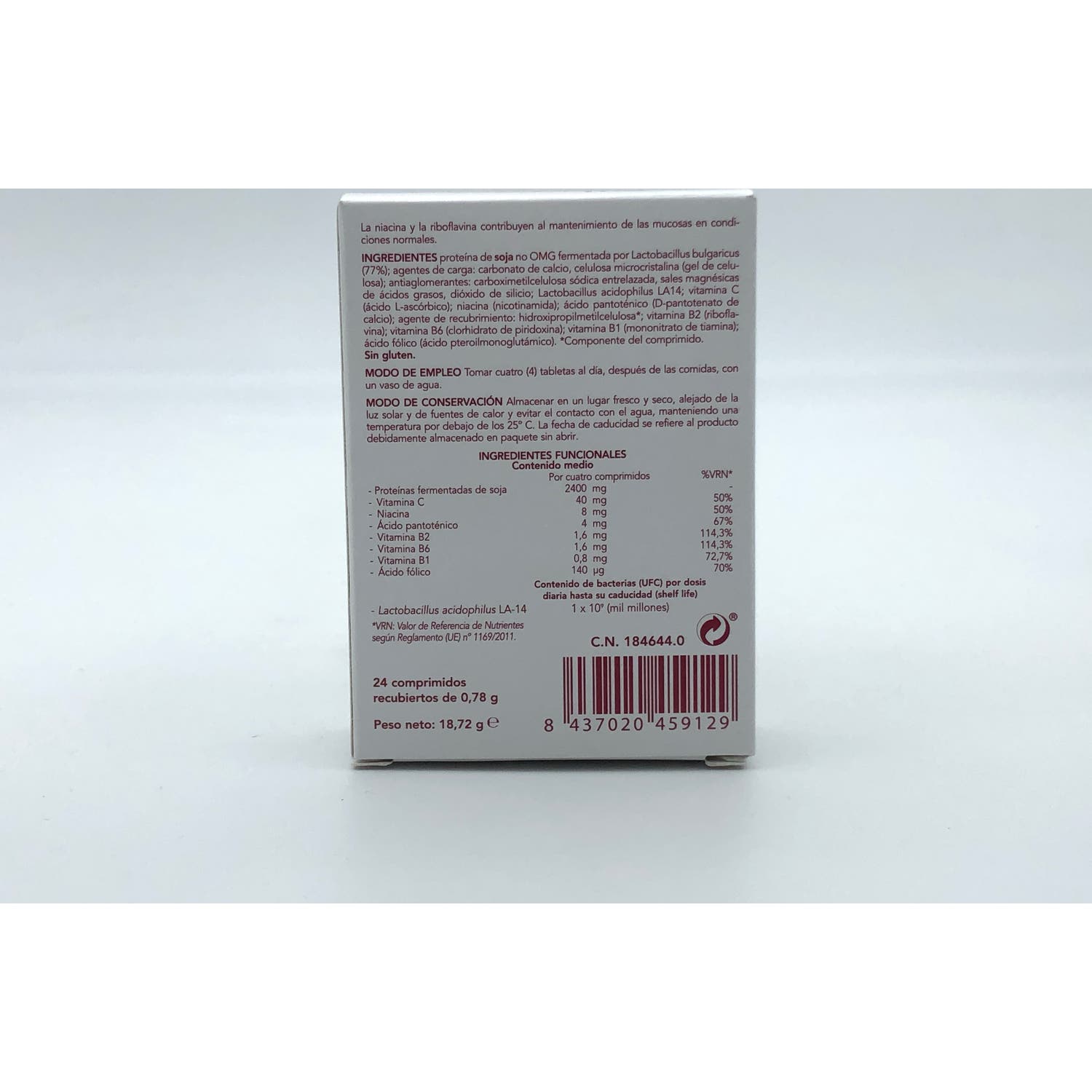 Proteinas de sojano OMG fermentada por lactobacillus bulgaricus (77%), antiaglomerantes: carboximetilcelulosa de sodio, celulosa microcristalina, sales de magnesio de los ácidos grasos, dióxido de silicio, carbonato de calcio, lactobacillus acidophillus LA14, vitamina C, niacina (vitamina PP), pantotenato de calcio, agente de recubrimiento: hidroxipropilcelulosa, vitamina B2 (roboflavina), vitamina B6 (clorhidrato de piridoxina), vitmaina B1 (mononitrato de tiamina, ácido fólico.)