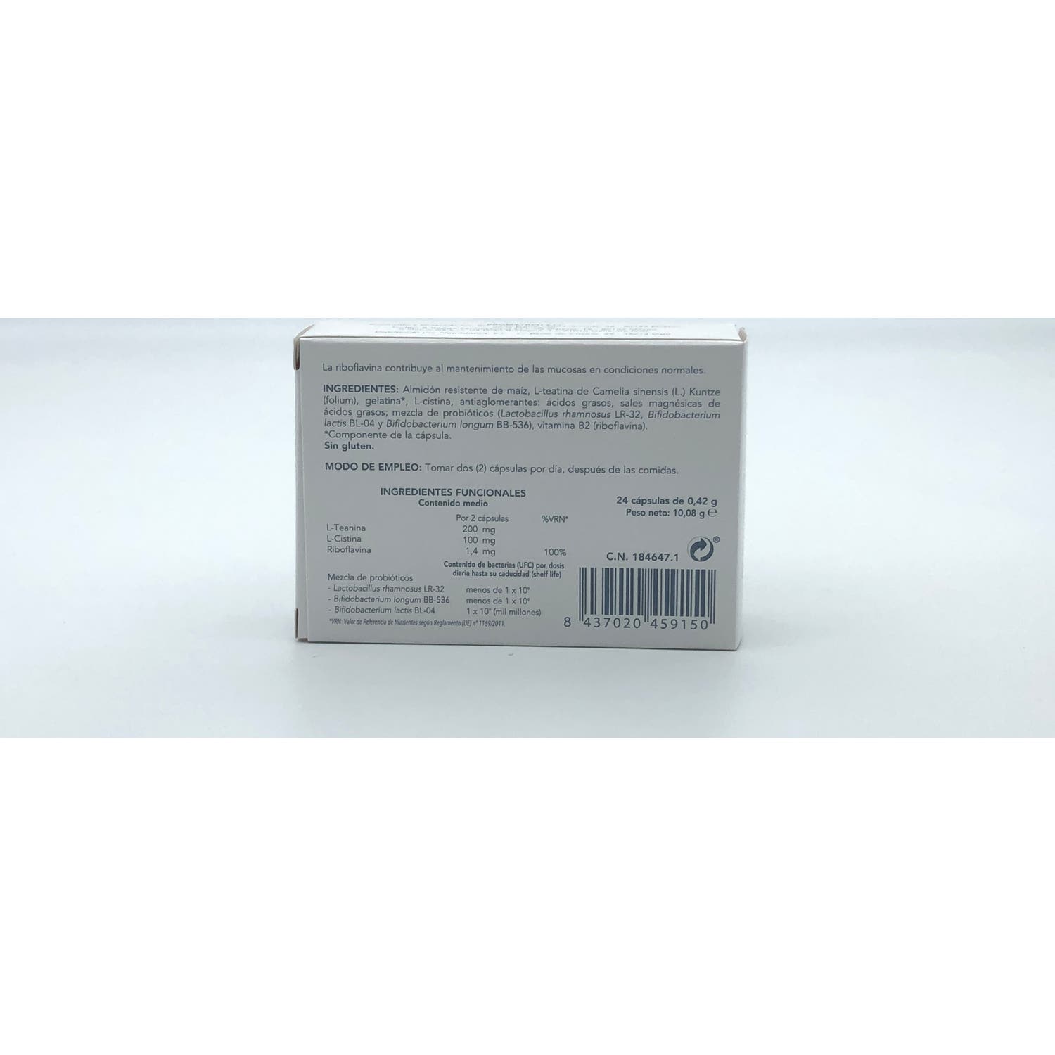 Complemento alimenticio en formato cápsula, elaborado a base de L-teanina, L-cisteína, vitamina B2 y fermentos lácteos, que ayudan a proteger la integridad de la barrera intestinal.