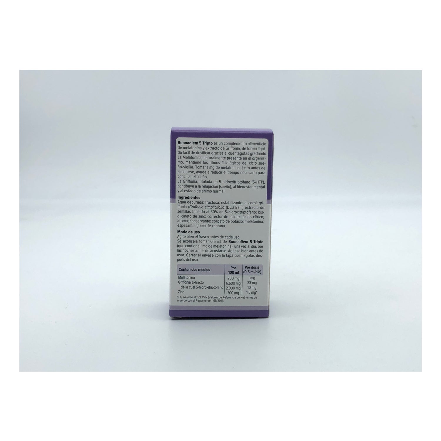 Agua Purificada, Fructosa; Estabilizador: Glicerol; Griffonia (Griffonia Simplicifolia (Dc.) Baill) Semilla, Por Ejemplo, Tit. 98% En 5-Hidroxitriptófano, Bisglicinato De Zinc; Acidulante: Ácido Cítrico; Aroma; Conservante: Sorbato De Potasio; Melatonina; Espesante: Goma Xantana.