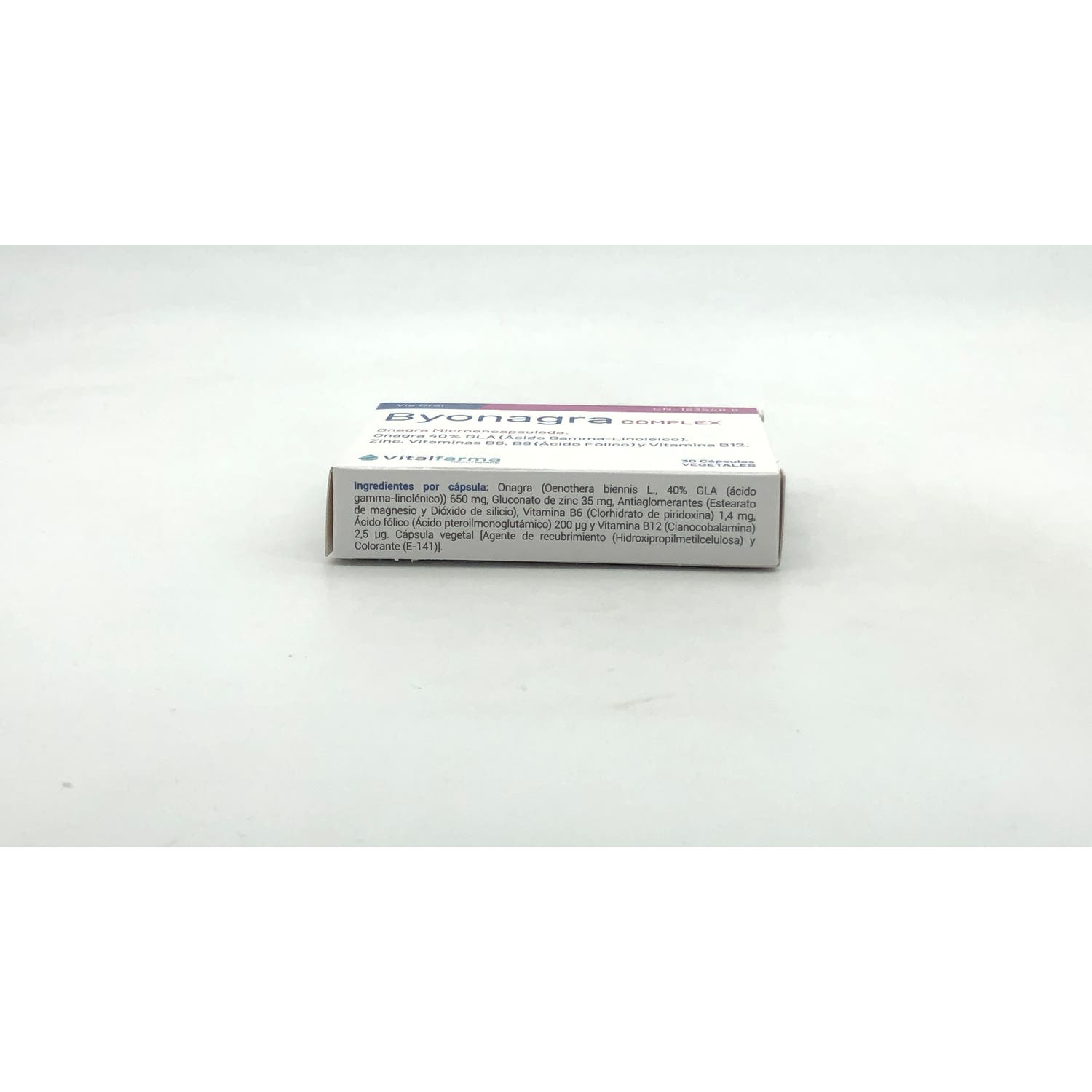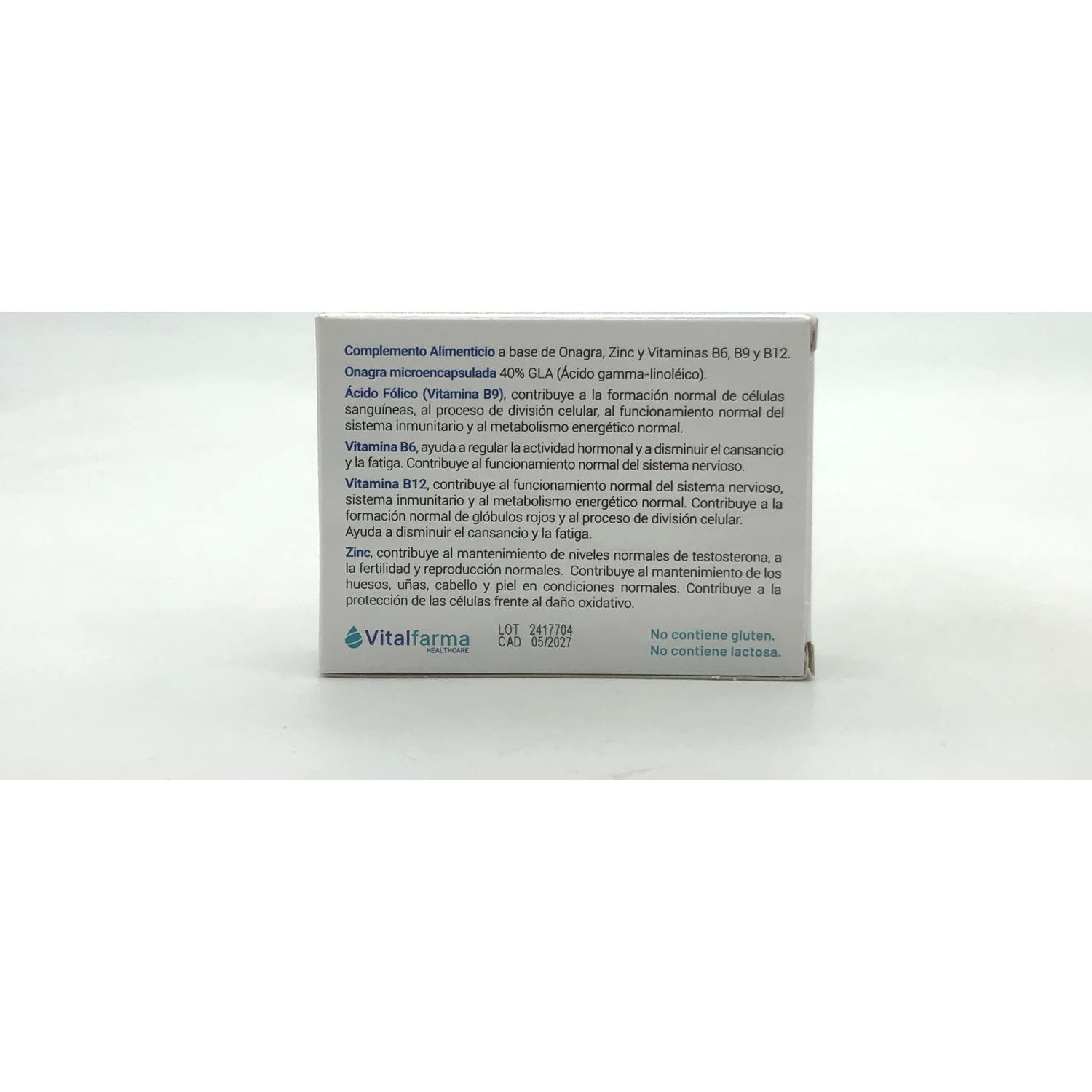 Complemento alimenticio a base de Onagra Microencapsulada 40% GLA (Ácido gamma-linolenico), Zinc y Vitaminas B6, B9 y B12, que contribuyen a regular la actividad hormonal, al mantenimiento de la piel, uñas y cabello en condiciones normales, a la protección de las células frente al daño oxidativo, a la fertilidad y reproducción normales, y al funcionamiento normal del sistema nervioso y del sistema inmunitario.