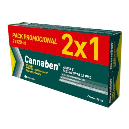 Cannaben Crema 2x120 ml es un producto de uso tópico que combina Cannabidiol (CBD) en alta concentración, aceite esencial de Romero y extracto de Árnica. Esta crema también incluye aceite Neossance® Squalane, que favorece una mejor liberación del CBD en la piel. Su aplicación, realizada mediante un suave masaje, proporciona una rápida sensación de alivio y confort, contribuyendo al mantenimiento del estado óptimo de la piel.