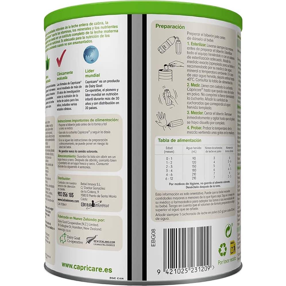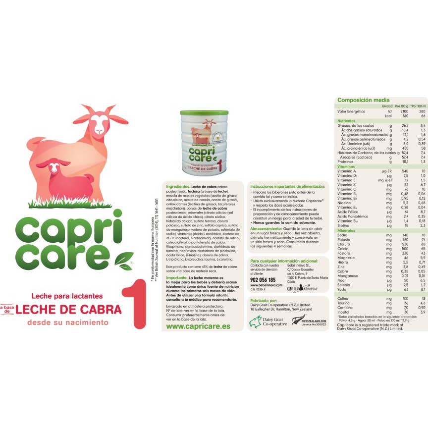 Leche entera de cabra pasteurizada, lactosa (de la leche), mezcla de aceites vegetales (aceite de girasol alto oleico, aceite de canola, aceite de girasol, antioxidantes (lecitina de girasol, tocoferoles mixtos)), leche de cabra pasteurizada en polvo, aceite de pescado en polvo (fuente del ácido docosahexaenoico), aceite de Mortierella alpina en polvo (fuente del ácido araquidónico), minerales (citrato de sodio, citrato de calcio, hidróxido cálcico, cloruro de potasio, sulfato ferroso, sulfato de cinc, sulfato cúprico, sulfato de manganeso, yoduro de potasio, selenito de sodio), cloruro de colina, L-tirosina, L-triptófano, L-cistina, vitaminas (acetato de dl- a-tocoferilo, ácido L-ascórbico, nicotinamida, colecalciferol, acetato de retinilo, d-pantotenato de calcio, cianocobalamina, fitomenadiona, clorhidrato de tiamina, riboflavina, clorhidrato de piridoxina, ácido fólico, d-biotina), L-isoleucina, taurina, L-carnitina. Este producto contiene un 38 % de leche de cabra en materia seca.