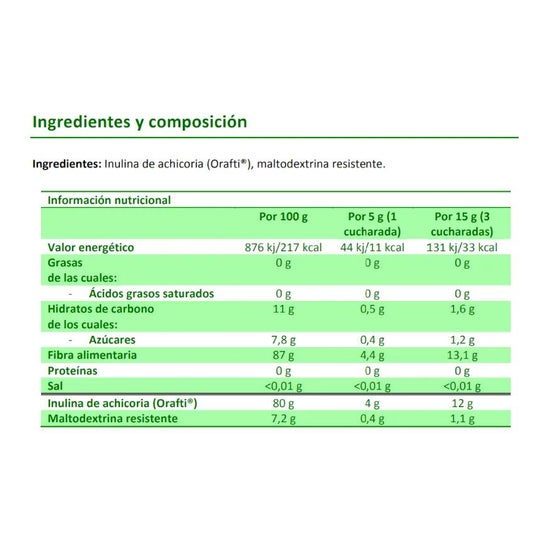 Elaborada a base de fibra vegetal en polvo. Su fórmula contiene Inulina de Achicoria y Maltodextrina resistente, que contribuye a mantener un sistema digestivo saludable y equilibrado, además de mejorar el tránsito intestinal y mejorar la frecuencia de las deposiciones.