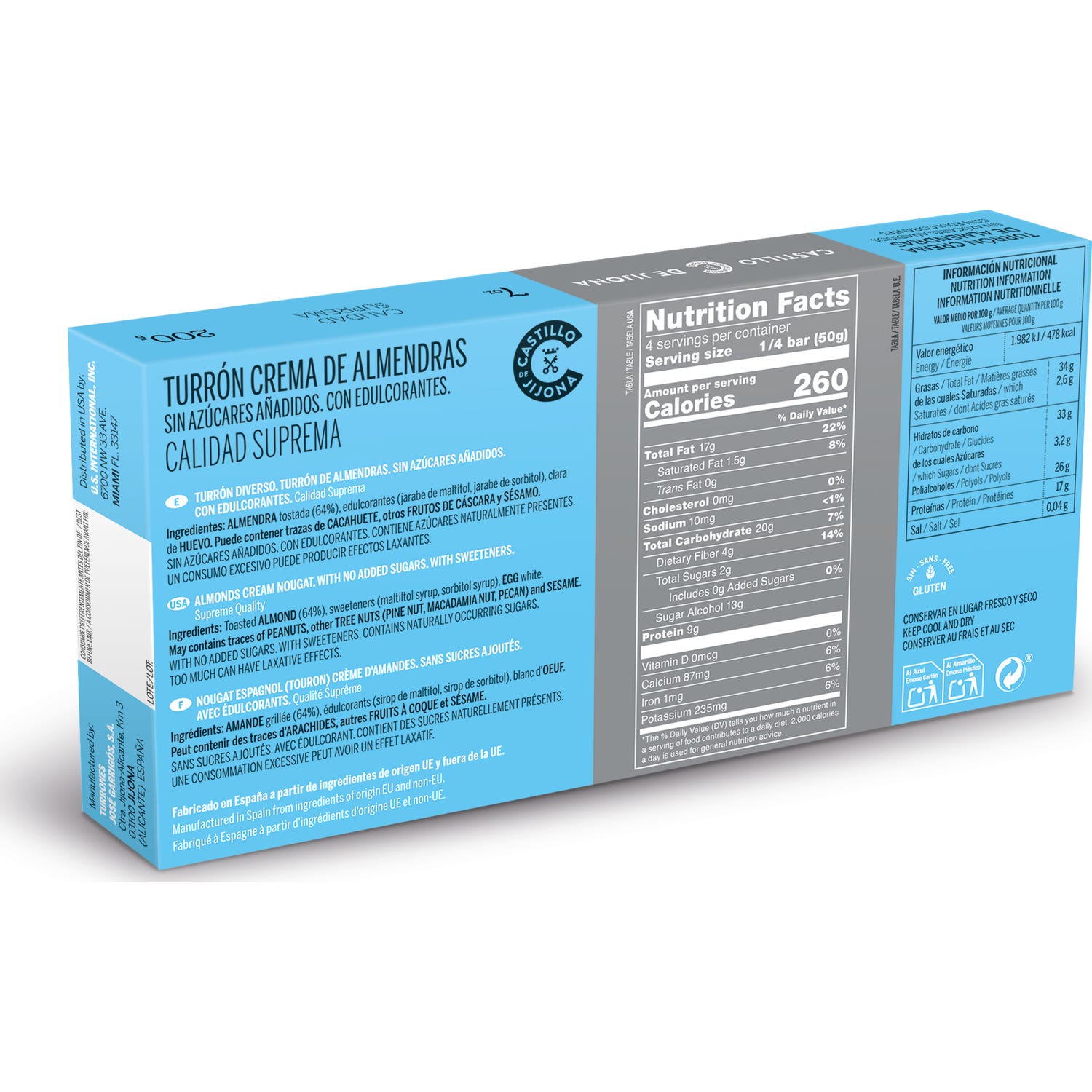 La combinación de almendras y edulcorantes seleccionados proporciona un dulzor característico, manteniendo una textura suave y agradable. Este producto es ideal para quienes buscan disfrutar de un dulce sin la preocupación del contenido de azúcar, ya que se han utilizado edulcorantes que preservan el sabor sin añadir azúcares.
