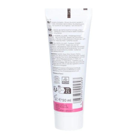 Cattier Dentífrico Niños 2-6 Años 50ml es una pasta de dientes infantil con sabor a frambuesa que ayuda a mantener los dientes y las encías fuertes y sanas. Adecuado para niños de 2 a 6 años.