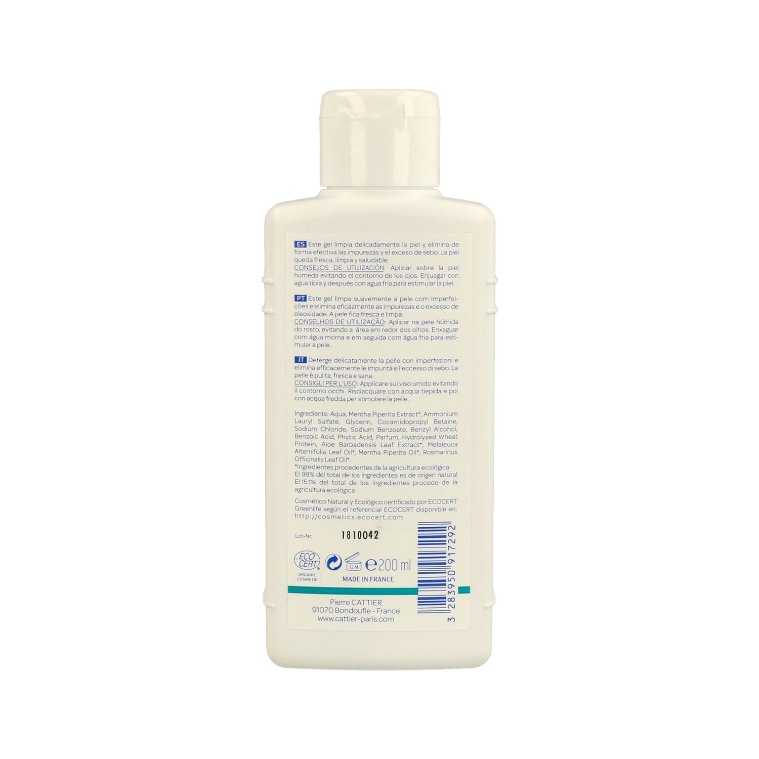 Cattier Gel Limpiador Purificante Menta Arbol de Té BIO 200ml es un limpiador facial para pieles con imperfecciones que ayuda a eliminar las impurezas y el exceso de sebo.
