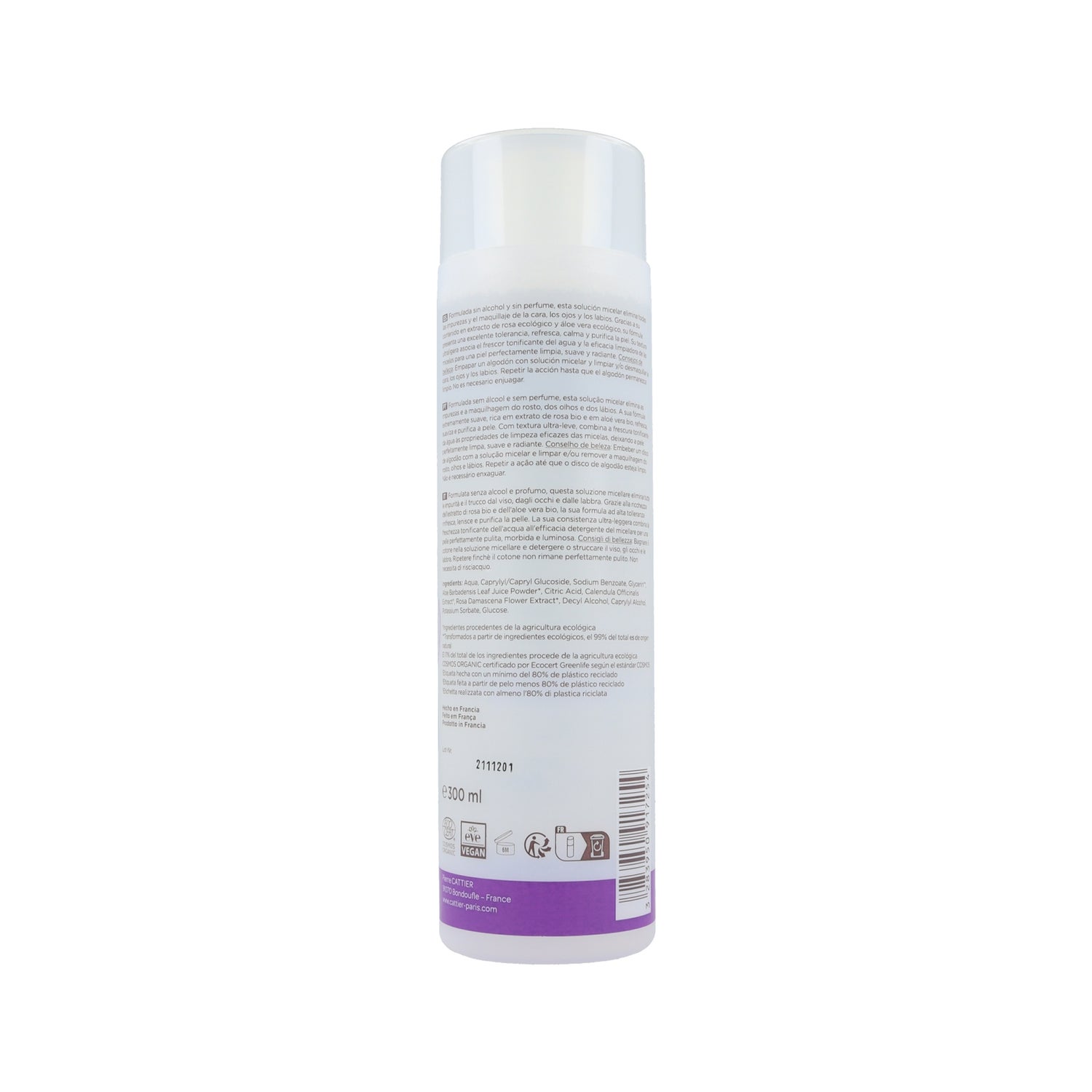 Cattier Solución Micelar Desmaquilladora 300ml es un agua micelar que limpia delicadamente todo tipo de impurezas y restos de maquillaje en rostro, ojos y labios.
