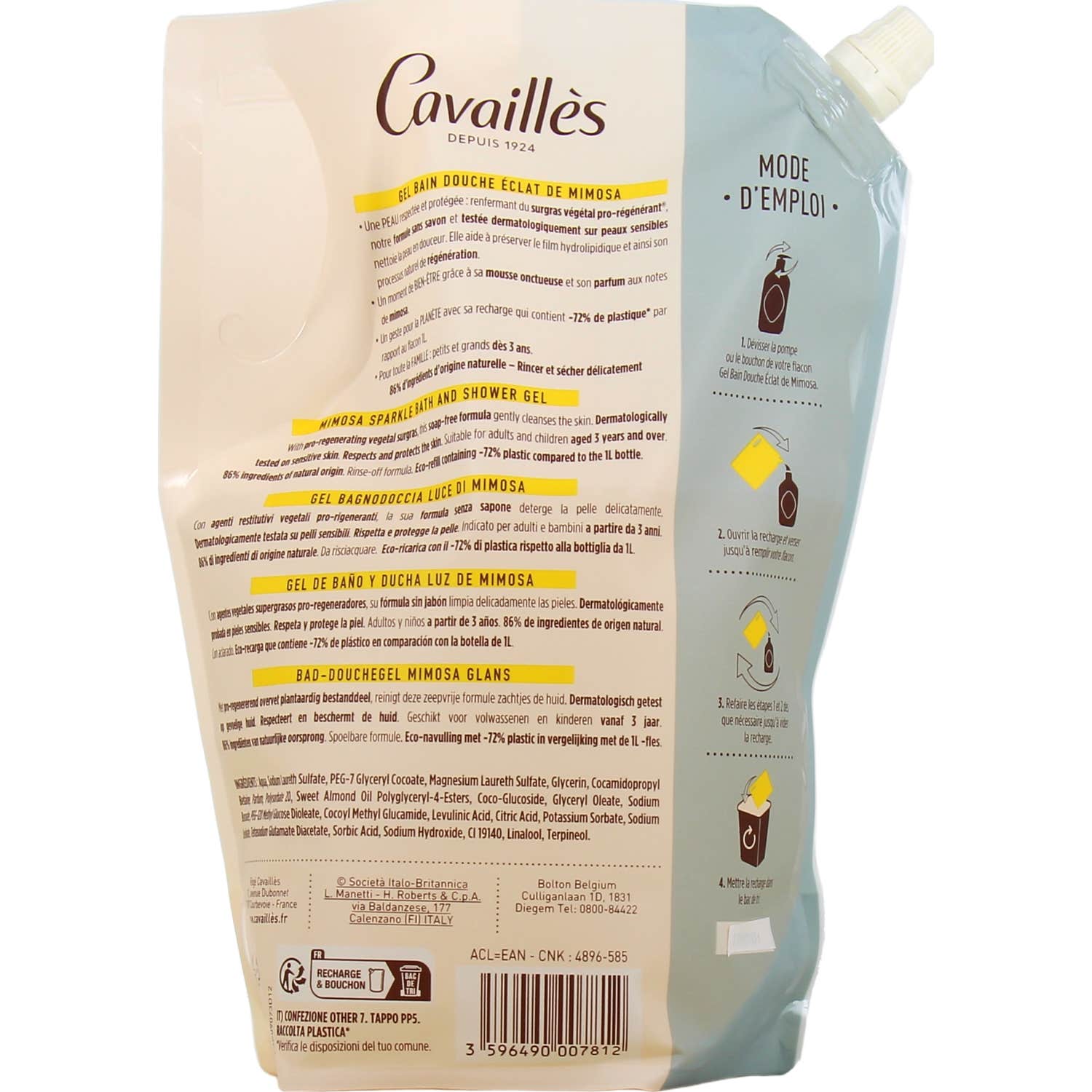 Cavaillès Gel de Ducha Éclat de Mimosa Eco-Recarga 1000 ml es un gel de ducha formulado especialmente para respetar y proteger la piel. Contiene un activo vegetal pro-regenerante que, junto a su composición sin jabón, ha sido dermatológicamente testado en pieles sensibles, garantizando una limpieza suave.