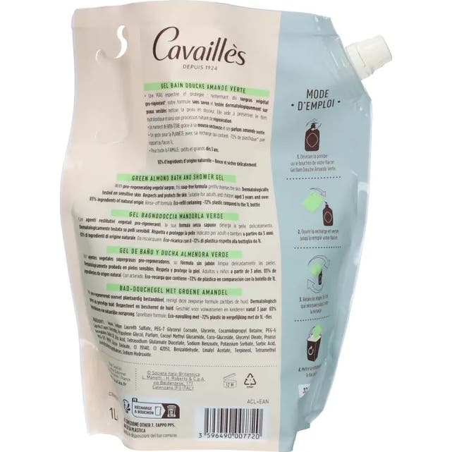 Cavailles Gel Ducha Almendra Verde Eco Recargo 1000 ml es un producto diseñado para el cuidado de la piel de toda la familia, adecuado para personas a partir de 3 años. Su fórmula, enriquecida con surgras vegetal pro-regenerante, permite una limpieza suave y respetuosa, preservando el proceso natural de regeneración de la piel.