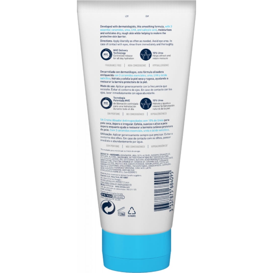 CeraVe® SA Crema Alisadora Anti-Rugosidades 177ml es una crema formulada para suavizar, alisar e hidratar la piel de forma eficaz, ayudando a reparar la barrera natural de la piel.