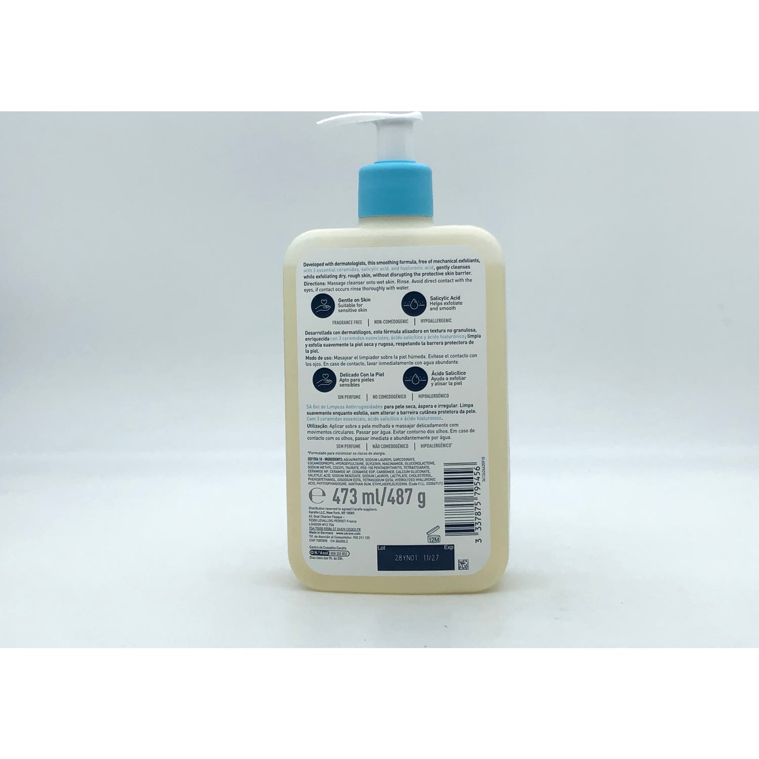 Formulado con 3 ceramidas esenciales que ayudan a mantener la barrera natural de la piel, ácido salicílico que actúa como exfoliante suave, eliminando las células muertas y niacinamida que ayuda a calmar la piel.
