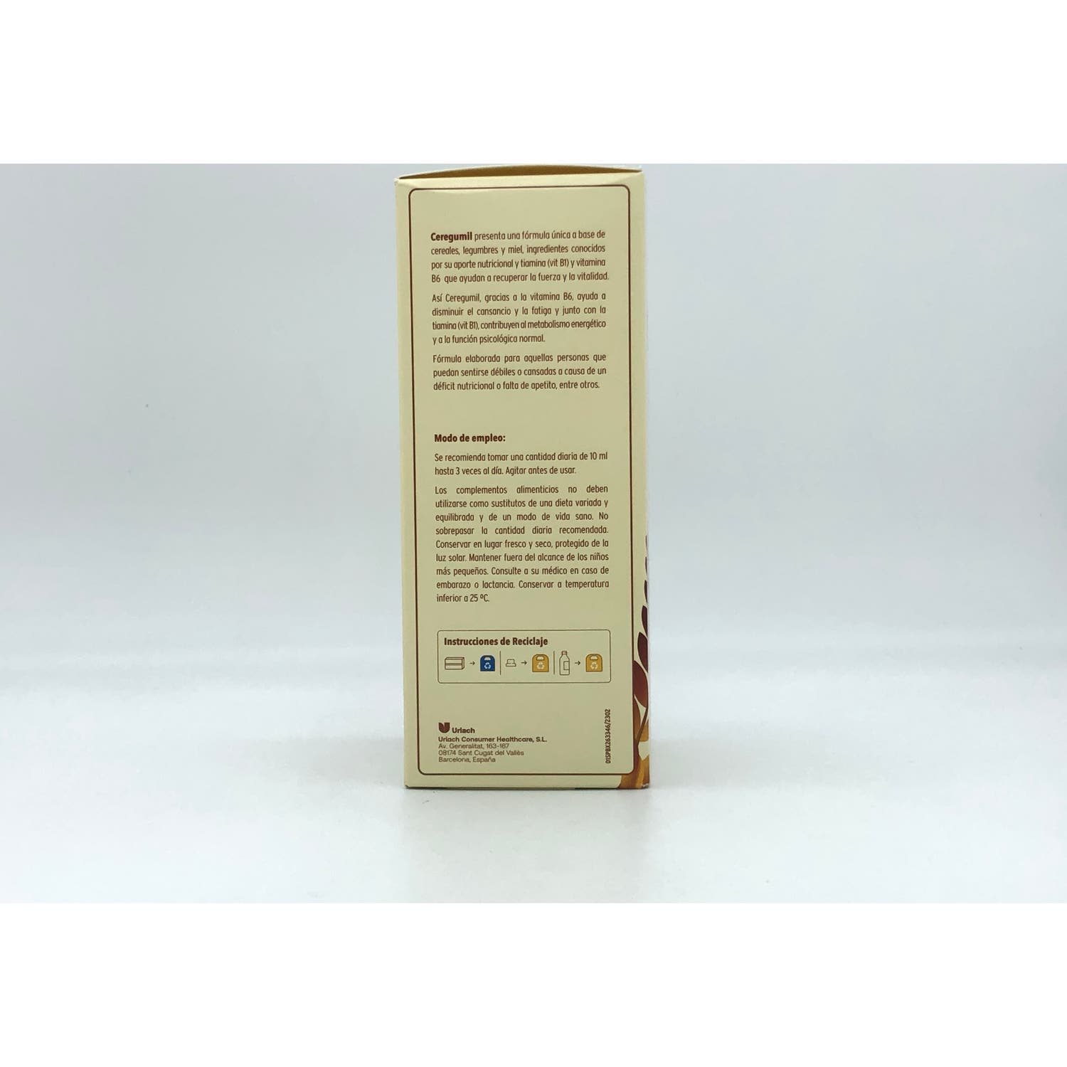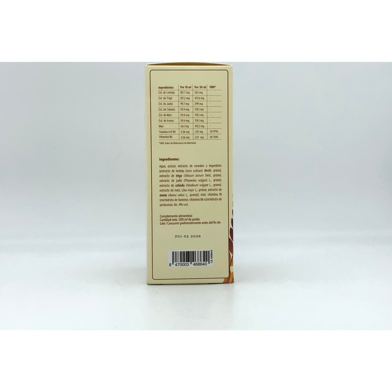 Mezcla de cereales y leguminosas (extracto de lenteja (Lens culinaris I.), trigo (Triticum durum d.), judía (Phaseolus vulgaris), cebada (Hordeum vulgare I.), maíz (Zea mays I.), avena (Avena sativa), agua y etanol (<5%)), vitamina B1 (Clorhidrato de tiamina) y vitamina B6 (Clorhidrato de piridoxina), miel, azúcar y glicerofosfato de calcio.