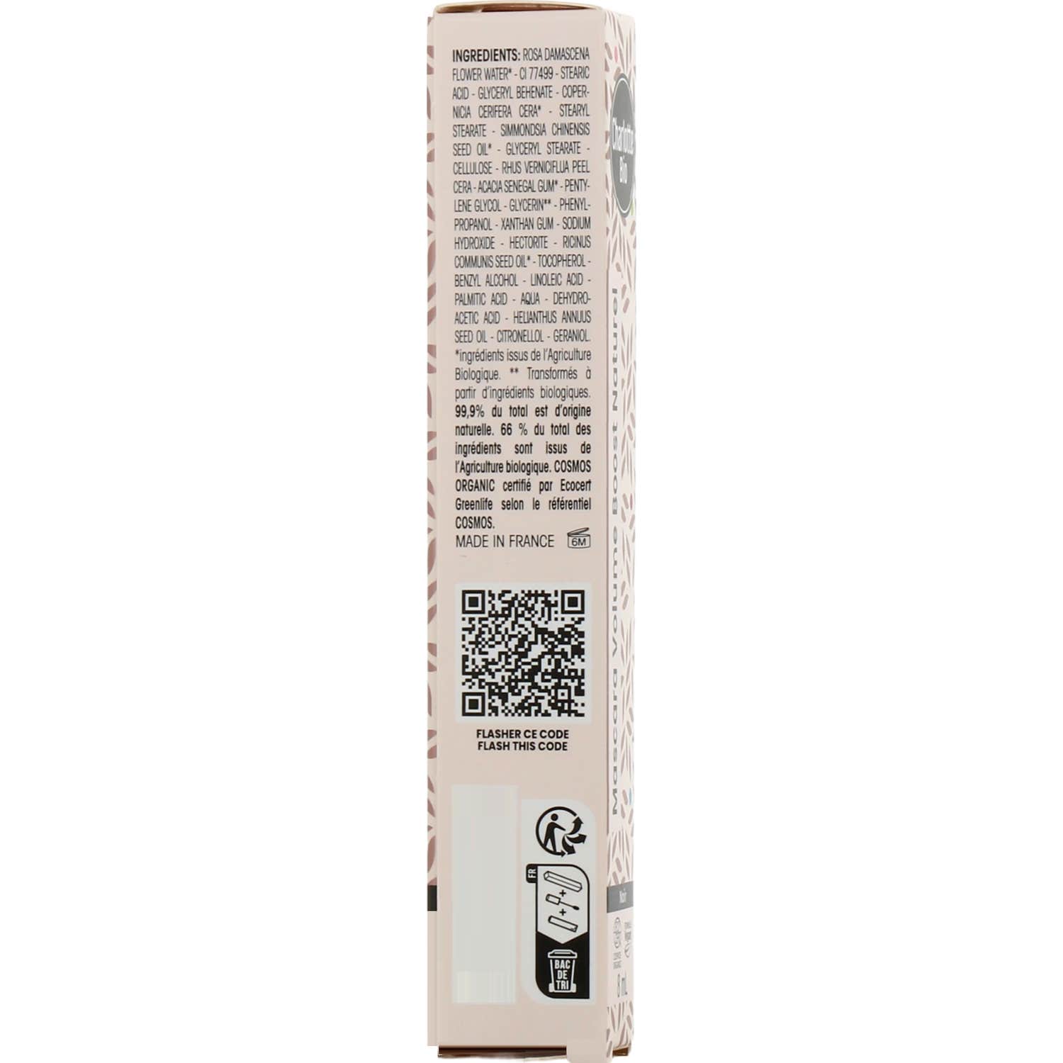 Charlotte Bio Máscara Volume Boost Naturel Black 8ml es un producto que destaca por su fórmula ecológica y natural, compuesta en un 99,99% de ingredientes de origen natural, de los cuales el 66% proviene de la agricultura ecológica. Este rímel está certificado como vegano y cuenta con acreditaciones de Cosmebio y Ecocert, lo que garantiza su compromiso con el medio ambiente y su elaboración sin pruebas en animales, conforme a la normativa europea.