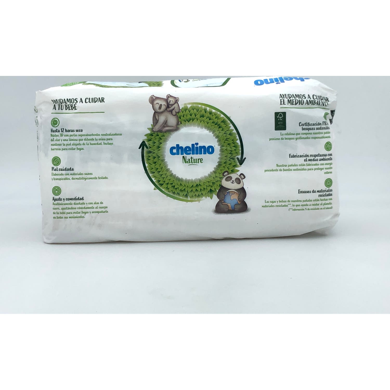 Pañales para bebé de Chelino Nature. Están fabricados con fibras naturales que son respetuosas con el medio ambiente, ya que proceden de bosques ecológicos. Esto los hace también respetuosos con el cuidado dermatológico de la piel sensible de los bebés. Incorporan en su diseño unas bandas que están recubiertas con una loción compuesta por elementos naturales como el aloe (una sustancia protectora y calmante de la piel), así como grosella negra o extracto de ambiaty. Se ajustan bien al cuerpo del bebé para no causar incomodidad ni irritaciones. Esta talla concreta está pensada para bebés de entre 1Kg y 3Kg. Tienen un diseño anatómico para una buena adaptación. Se mantienen protegidos y secos hasta 12 horas gracias a unas bandas blancas que dispersan la orina, además de a unas perlas superabsorbentes.