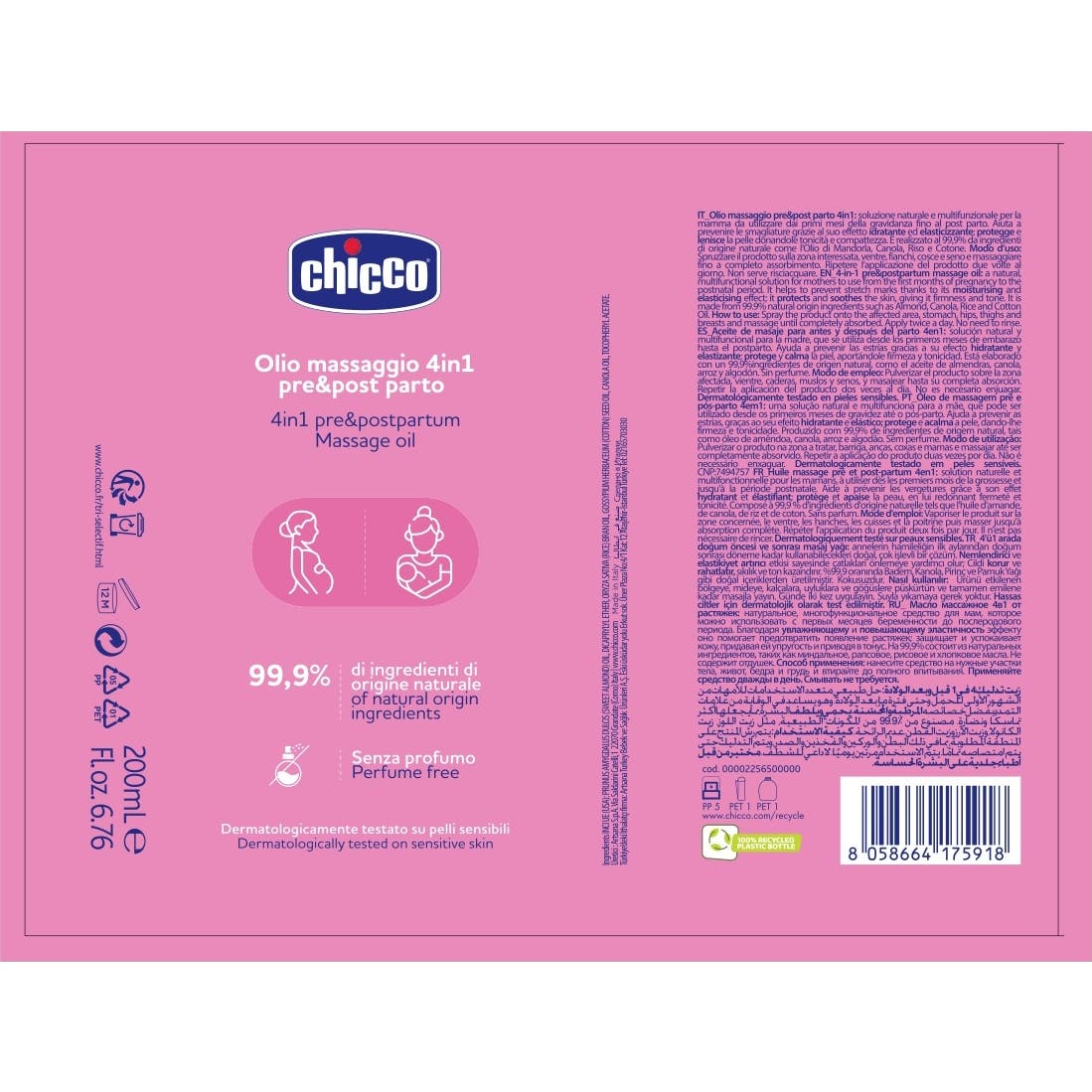 Chicco Aceite Masaje Pre y Posparto 4 en 1 200ml es una opción natural y versátil, diseñada para su uso desde los primeros meses de embarazo hasta el periodo postnatal. Este aceite se presenta como una solución integral que contribuye a la prevención de estrías.