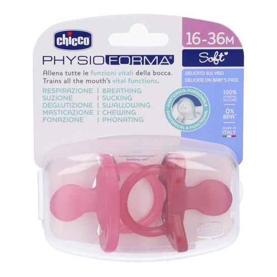 Chicco Physioforma Soft Rosa 2 uds para el desarrollo oral de bebés de 2-6 meses es un pack de 2 chupetes, fabricados en silicona 100% suave y flexible. Está diseñado para favorecer la respiración fisiológica y el correcto posicionamiento de la lengua, apoyando el crecimiento natural de la boca y el paladar en bebés de 2 a 6 meses.