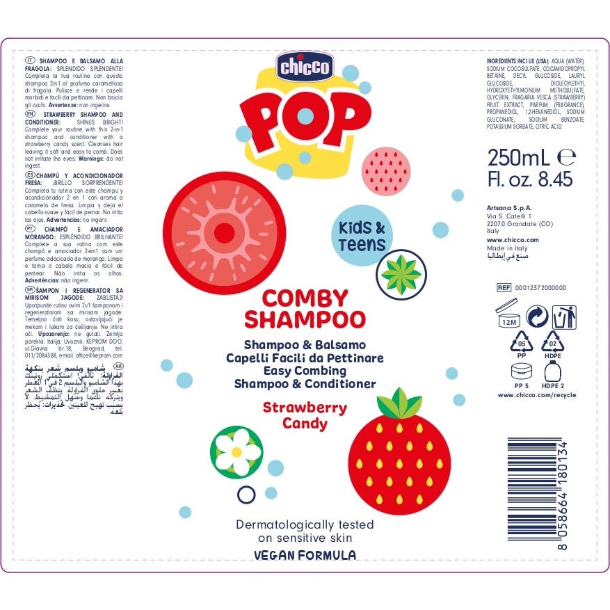 Chicco Pop Comby Champú & Acondicionador Fresa 250 ml es un producto diseñado específicamente para niños y pré-adolescentes. Este champú y acondicionador 2 en 1 permite disfrutar de un cabello que no solo es fácil de peinar, sino que también queda fragante y suave.