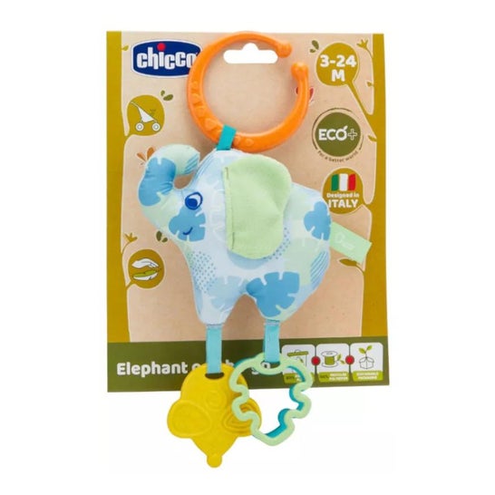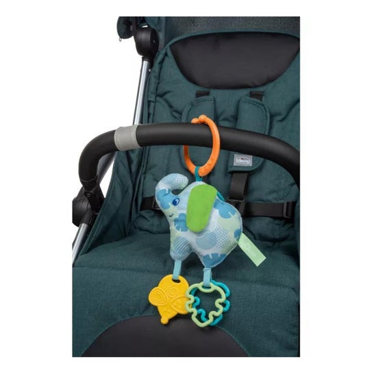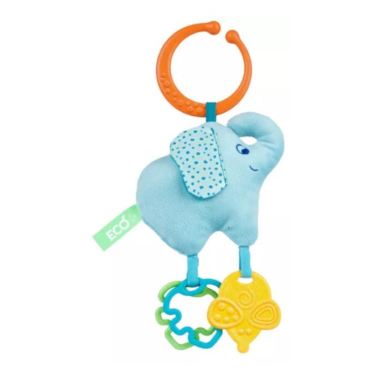 Sonajero con forma de elefante que ayuda a relajar a los más pequeños al momento de irse a dormir o paseos en coche. Contiene un anillo que contribuye a que sea fácil de incorporar en las cunas o carritos de bebé.