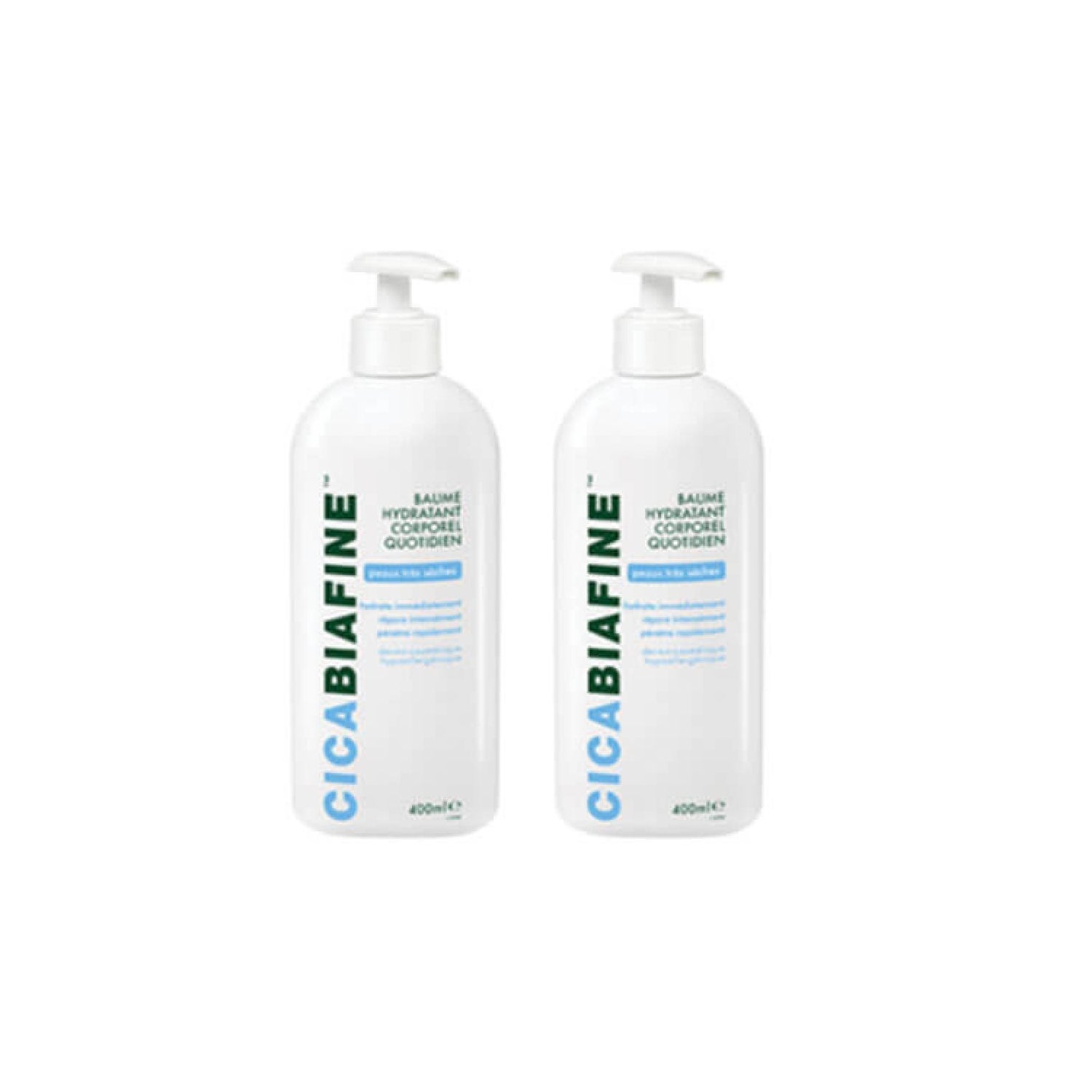 Pack de bálsamo corporal hidratante presentado en dos envases de 400ml. Desarrollado especialmente para reparar y reconfortar la piel. La fórmula está enriquecida con ácido hialurónico y pantenol, alivia e hidrata inmediatamente, repara intensamente desde la primera aplicación, penetra rápidamente sin pegajosidad.