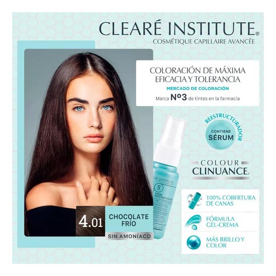 Clearé Institute Colour Clinuance 4.01 Chocolate Frío 170ml está formulado en gel-crema con provitaminas de algodón que no sólo minimiza el daño, sino que trata y fortalece cabello y cuero cabelludo. El tratamiento respeta al 100% el manto hidrolipídico de la piel.