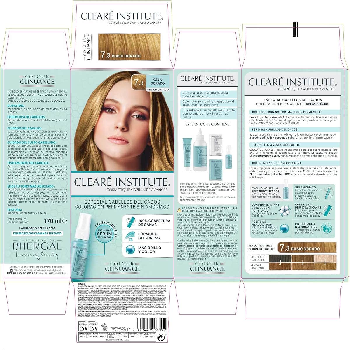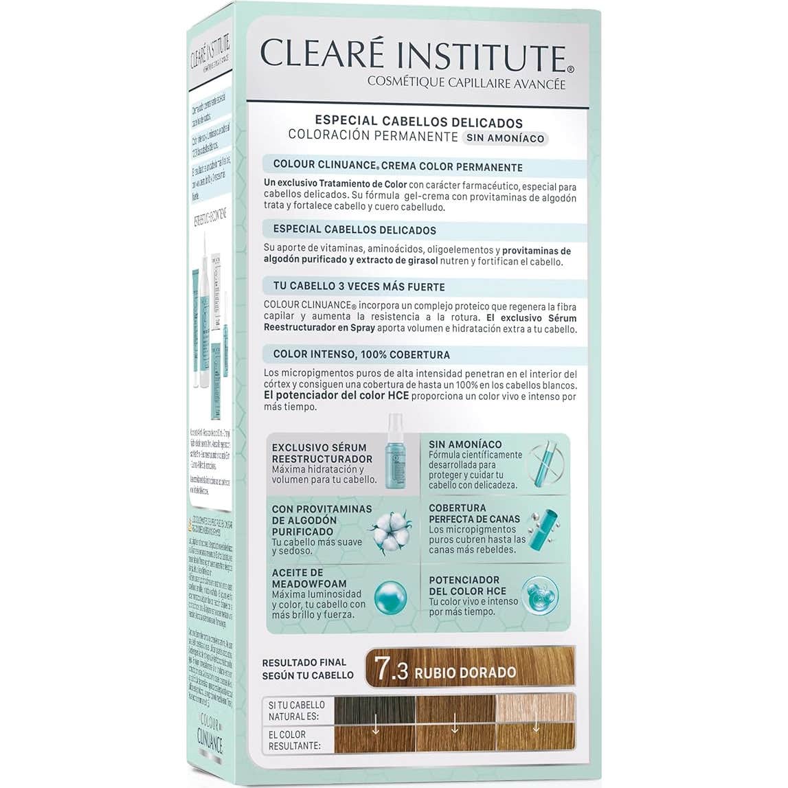 Clearé Institute Colour Clinuance 7.3 Rubio Dorado 170ml está formulado en gel-crema con provitaminas de algodón que no sólo minimizan el daño, sino que tratan y fortalecen cabello y cuero cabelludo. El tratamiento respeta al 100% el manto hidrolipídico de la piel.