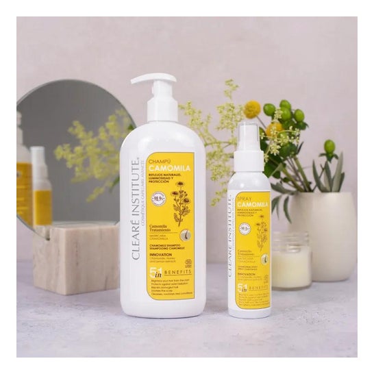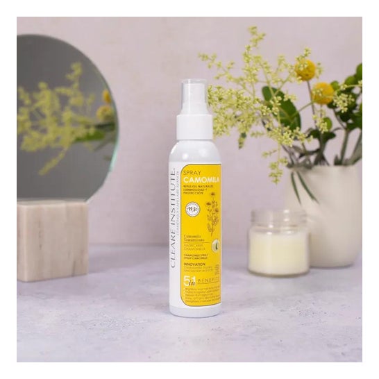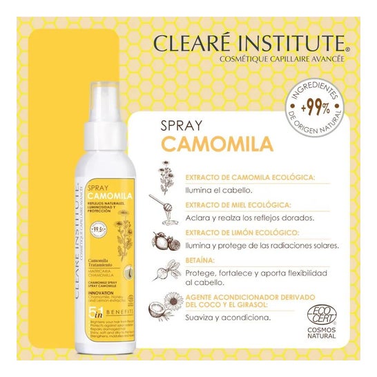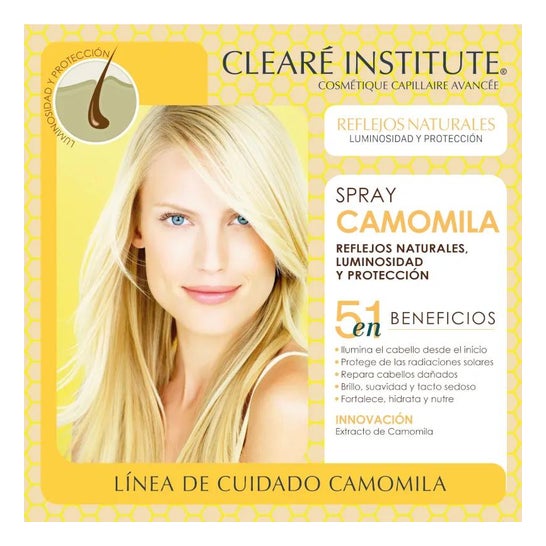 Clearé Institute Spray Camomila 125ml aviva los reflejos naturales y aporta protección y luminosidad al cabello. Además, aporta los siguientes beneficios: ilumina el cabello desde el inicio, protege frente a radiaciones solares, repara cabellos dañados, aporta brillo, suavidad y tacto sedoso, así como fortalece, hidrata y nutre.