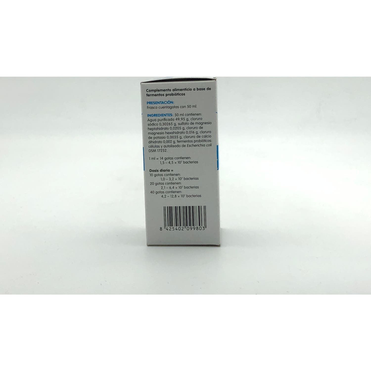 50 ml contienen: Agua destilada 49,91 g, cloruro sódico 0,30265 g, sulfato de magnesio 0,0205 g, cloruro de magnesio 0,016 g, cloruro de potasio 0,0035 g, cloruro de calcio 0,002 g, fermentos probióticos: células y autolisado de Escherichia coli.