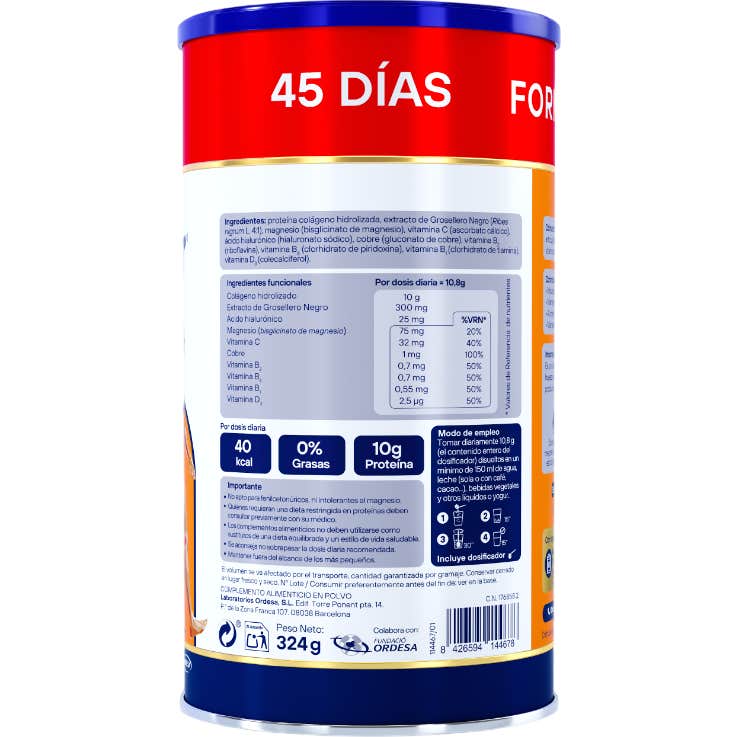Con una composición obtenida a partir de materias primas naturales. Enriquecido con vitamina C, ácido hialurónico y magnesio, que promueven el alivio de la sensación de cansancio o fatiga. No contiene conservantes, grasas, colorantes, azúcares, edulcorantes artificiales, alérgenos ni transgénicos. Con sabor y aroma neutros, recomendado para mezclar con leche, agua o yogur.