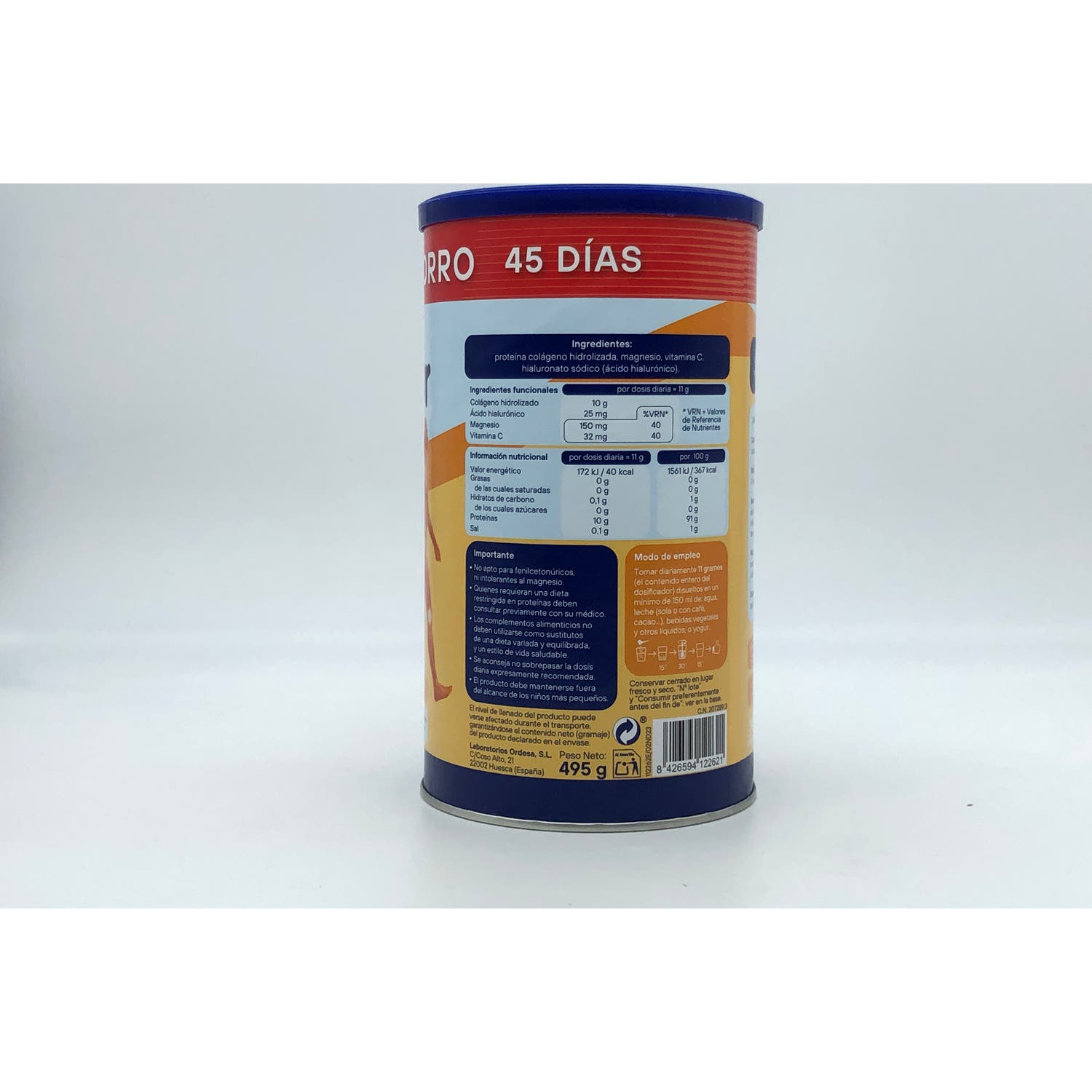 Proteína colágeno hidrolizada 91 g, citrato de Magnesio 8,7 g, L-ascorbato cálcico (vitamina C) 440 mg, ácido hialurónico 227 mg.