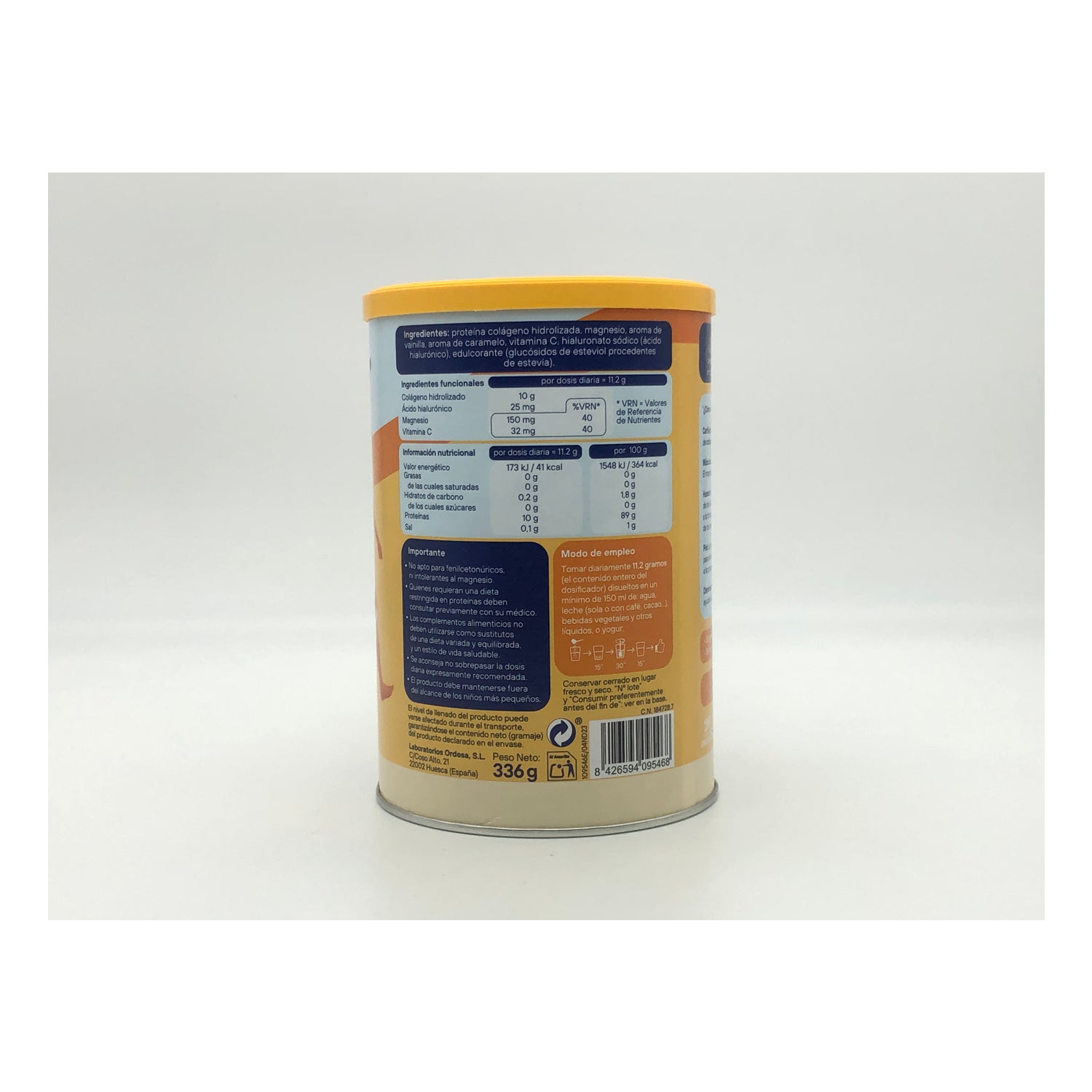 Proteína colágeno hidrolizada 89 g, citrato de Magnesio 8,7 g, aroma de vainilla, aroma de caramelo, L-ascorbato cálcico (vitamina C) 440 mg, ácido hialurónico 223 mg, glucósidos de esteviol (edulcorante natural).