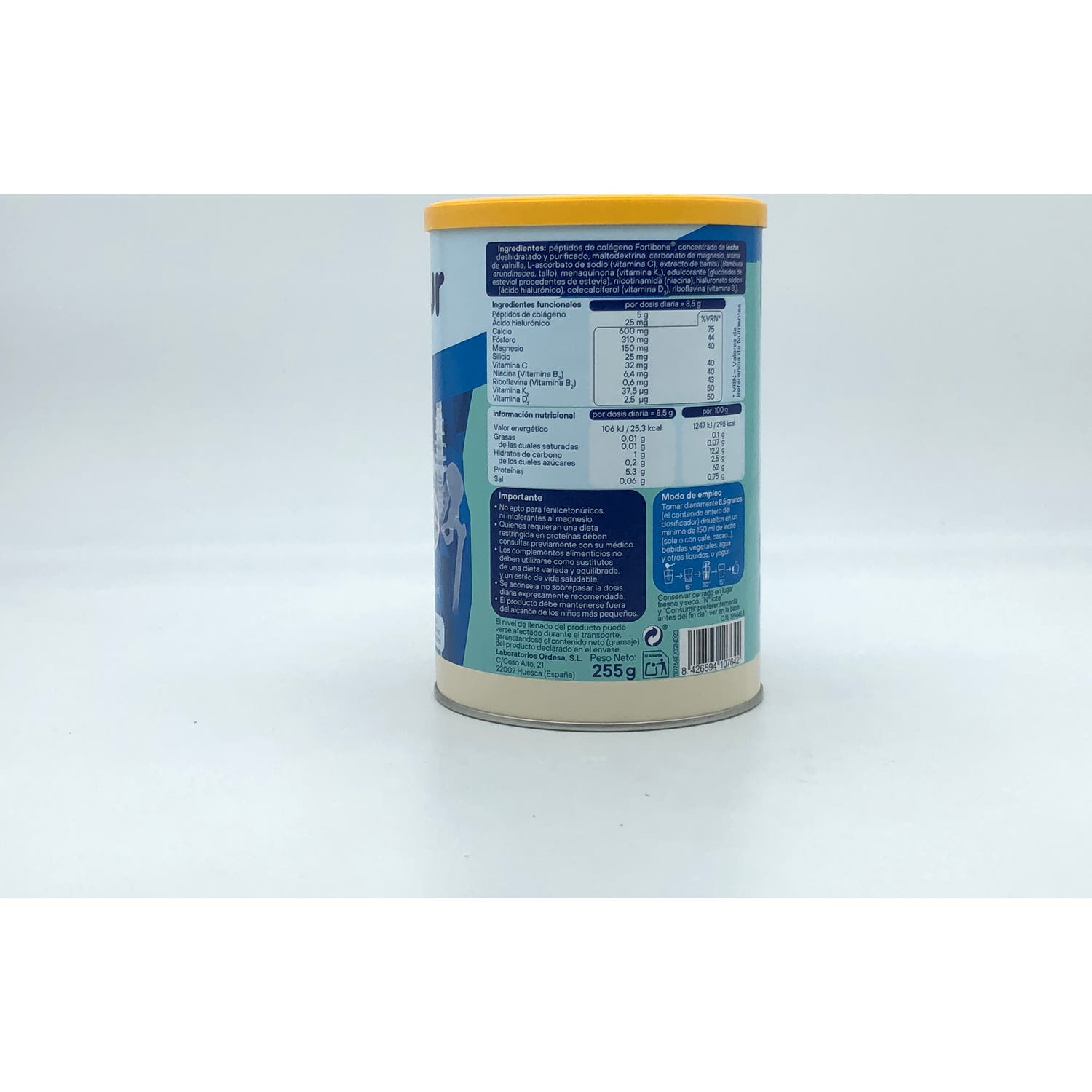 Péptidos de colágeno FORTIBONE®, concentrado de leche deshidratado y purificado, maltodextrina, carbonato de magnesio, aroma de vainilla, L-ascorbato de sodio (vitamina C), extracto de bambú (Bambusa arundinacea, tallo), menaquinona (vitamina K2), edulcorante (glucósido de esteviol), nicotinamida (niacina), hialuronato sódico (ácido hialurónico), colecalciferol (vitamina D3), riboflavina (vitamina B2).