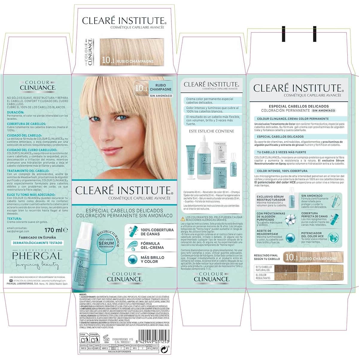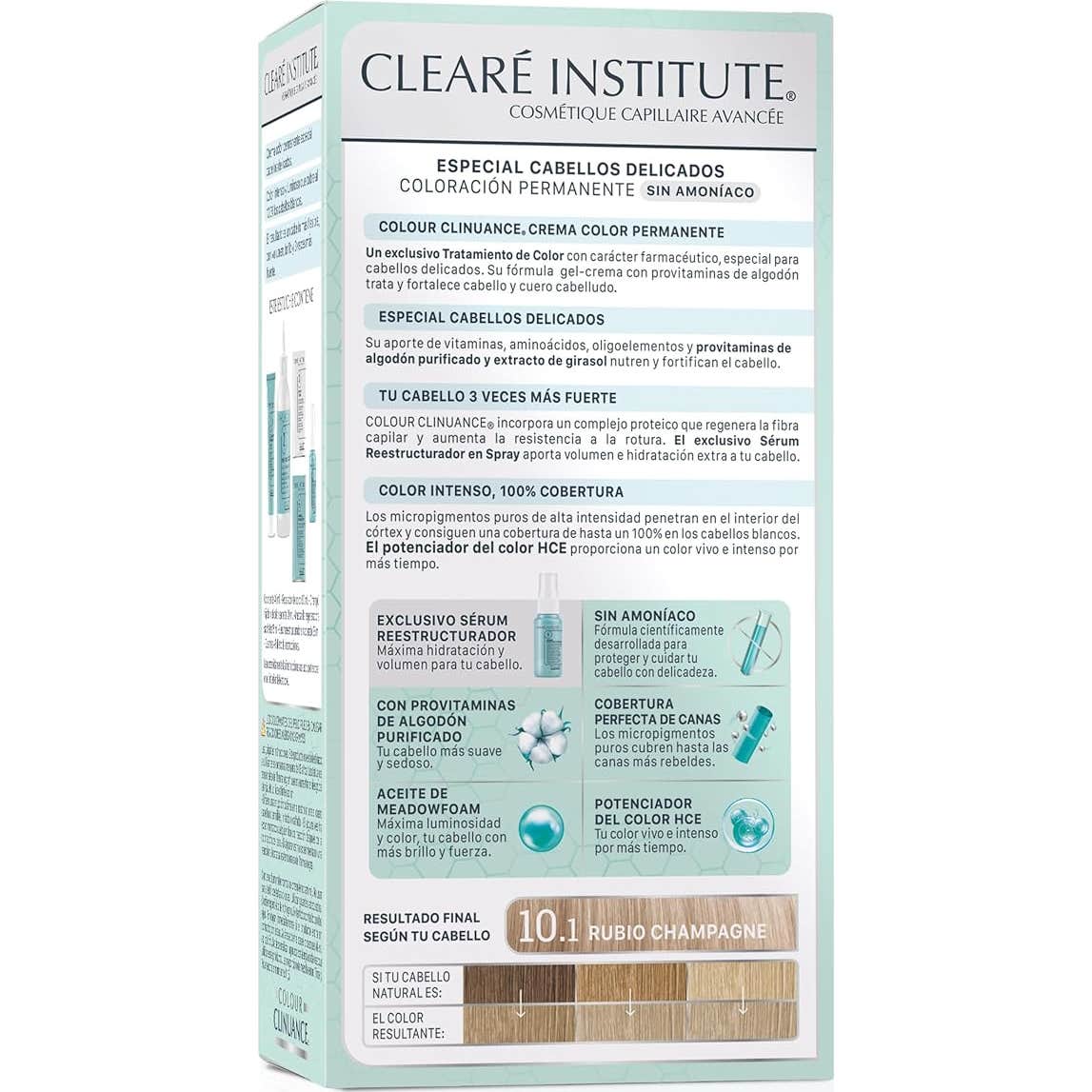 Clearé Institute Colour Clinuance 10.1 Rubio Champagne 170ml está formulado en gel-crema con provitaminas de algodón que no sólo minimiza el daño, sino que trata y fortalece el cabello y cuero cabelludo. El tratamiento respeta al 100% el manto hidrolipídico de la piel.