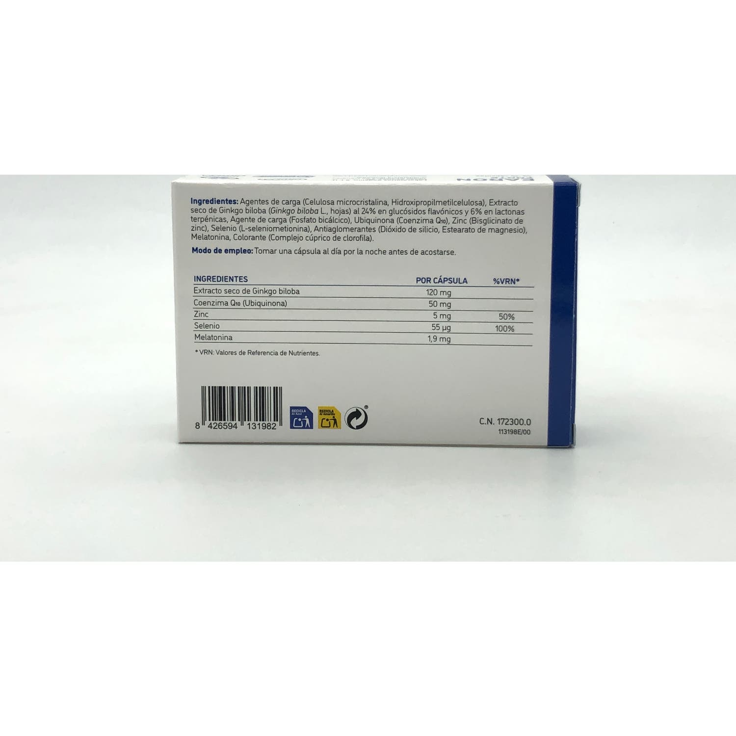 Contiene Ginkgo Biloba que estimula la circulación sanguínea y melatonina que aporta un efecto antioxidante. Además, su aporte en coenzima Q10 ayuda a reducir el déficit en persona con acúfenos (zumbidos) y zinc y selenio que contribuyen a proteger las células del daño oxidativo.