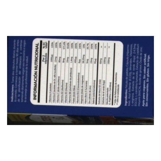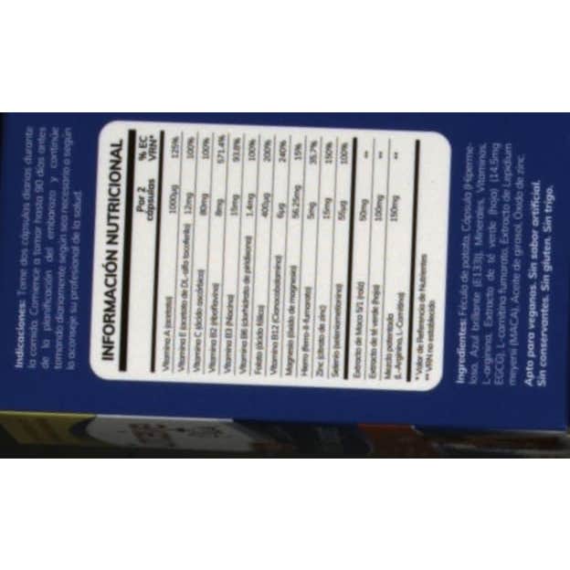 Por 2 cápsulas: Vitamina A (acetato), 1000 mcg Vitamina E (acetato de DL-alfa tocoferilo)….12 mg Vitamina C (ácido ascórbico), 80 mg Vitamina B2 (riboflavina), 8 mg Vitamina B3 (niacina), 15 mg Vitamina B6 (clorhidrato de piridoxina), 1,4 mg Folato (ácido fólico), 400 mcg Vitamina B12 (cianocobalamina), 6 mcg Magnesio (óxido de magnesio), 56,25 mg Hierro (ferro-II-fumarato), 5 mg Zinc (sulfato de zinc), 15 mg Selenio (seleniometionina), 55 mcg Extracto de maca 5/1 raíz, 50 mg Extracto de té verde hoja, 100 mg Mezcla patentada (L-arginina. L-carnitina), 150mg Excipientes.