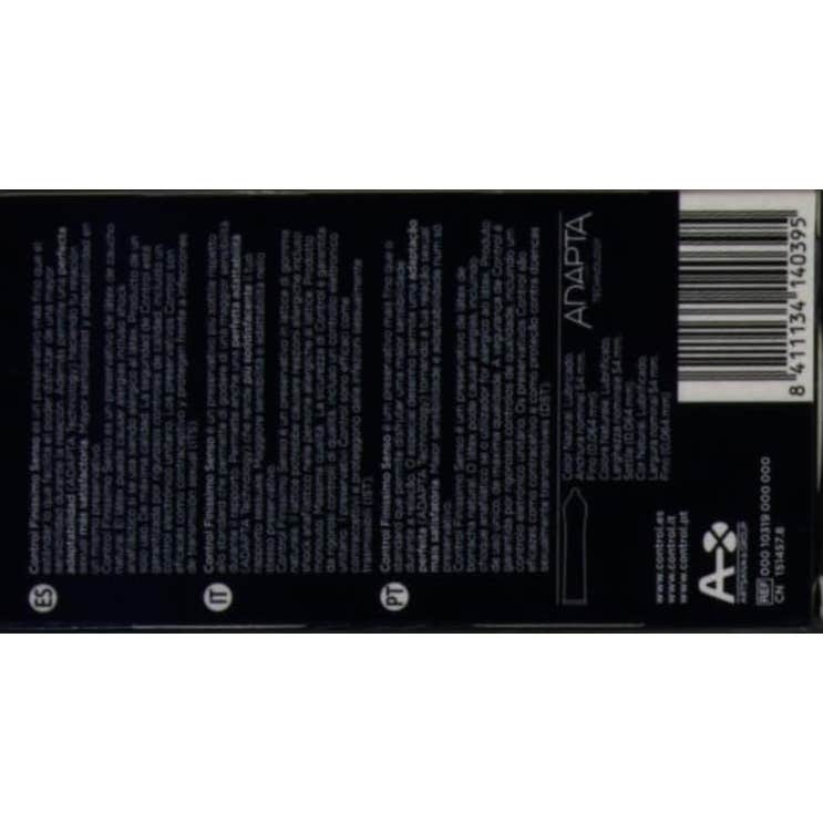 Preservativo de Control de la gama Finissimo, la gama más fina de Control. Ideada para proporcionar una mayor sensibilidad durante la relación. El diseño de grosor mínimo permite aumentar la sensibilidad a la vez que se adapta perfectamente y con total comodidad. El modelo senso presenta preservativos super finos, para una sensibilidad intensa. Toda la ergonomía de la forma Adapta. Extra fino, anatómico, transparente, lubricado y con depósito. Presenta anchura nominal de 54 mm y longitud de 19 cm. Envase con 12 unidades.
