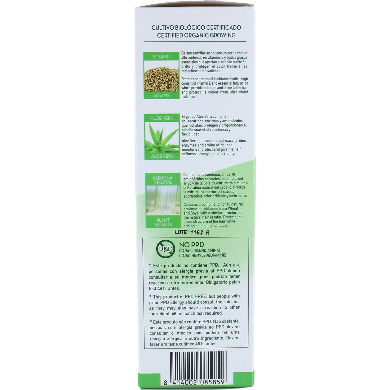 Coloración permanente enriquecida con aceite de Sésamo de cultivo Biológico certificado, extracto de Girasol y Keratina vegetal, que proporcionan al cabello una coloración permanente con un color intenso, luminoso y duradero. Proporciona una coloración duradera y protección del cabello.