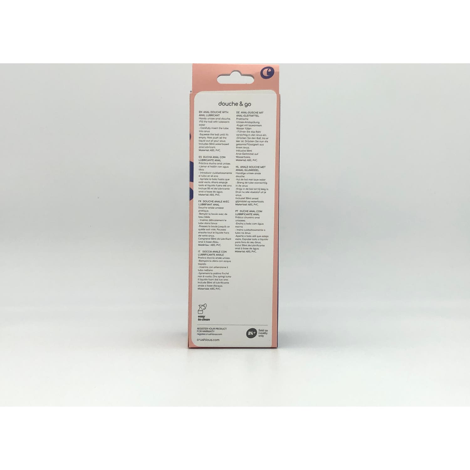 El set contiene 2 productos esenciales: El lubricante Anal Crushious con propiedades relajantes y base de agua y sin anestésicos y una ducha para realizar una correcta limpieza anal.